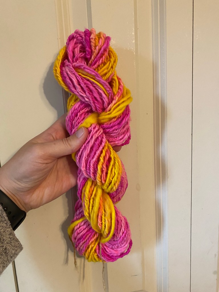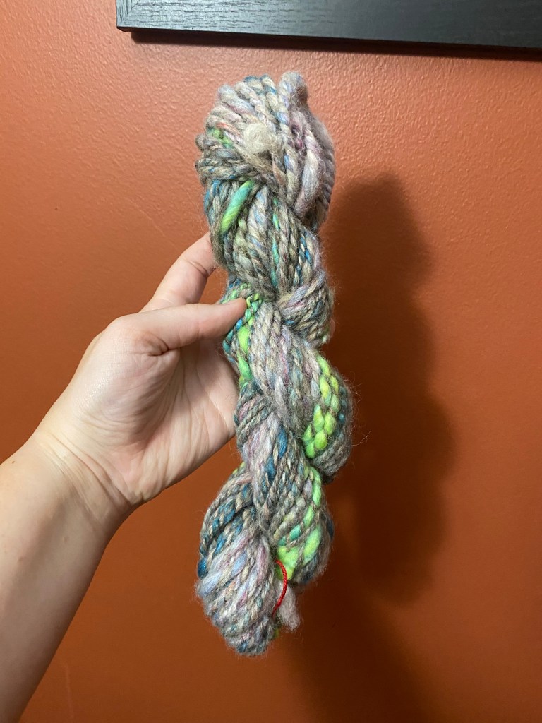 I opened up this braid and split the entire thing in half. I wasn’t overly scientific and just eye balled it. The plan is to spin half the braid onto one bobbin and the other half onto a second. Then I can 2-ply.