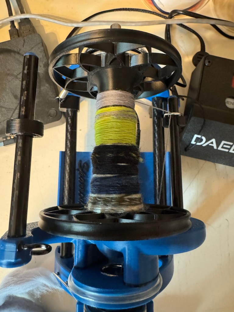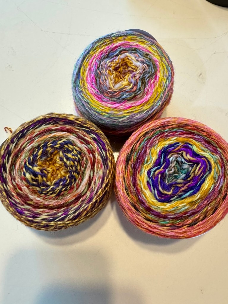 - Skein #2 on the right – 145 grams and 270 yards of DK ish. I ran out of singles on this one so the end is 2ply and thinner.