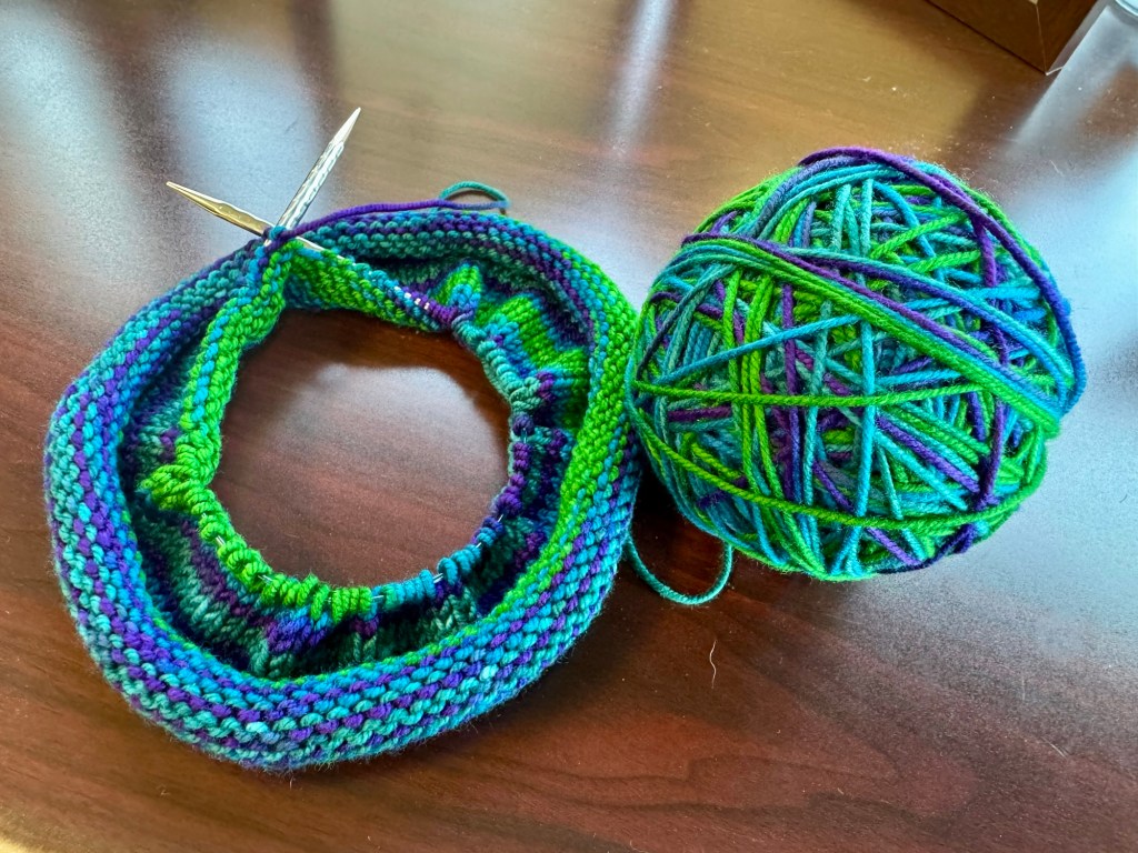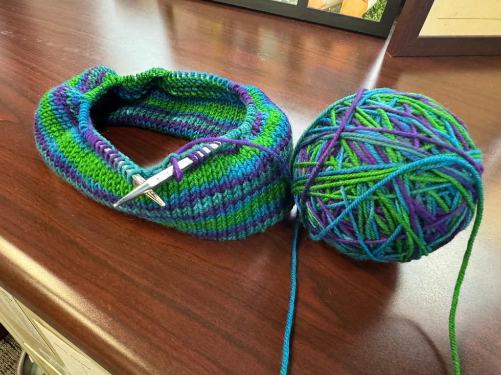 It’s been hard to keep working on this one as the Swiftie Beanie has been calling to me to work on. The bigger yarn and changing colors are giving me more dopamine than solid color in the round.