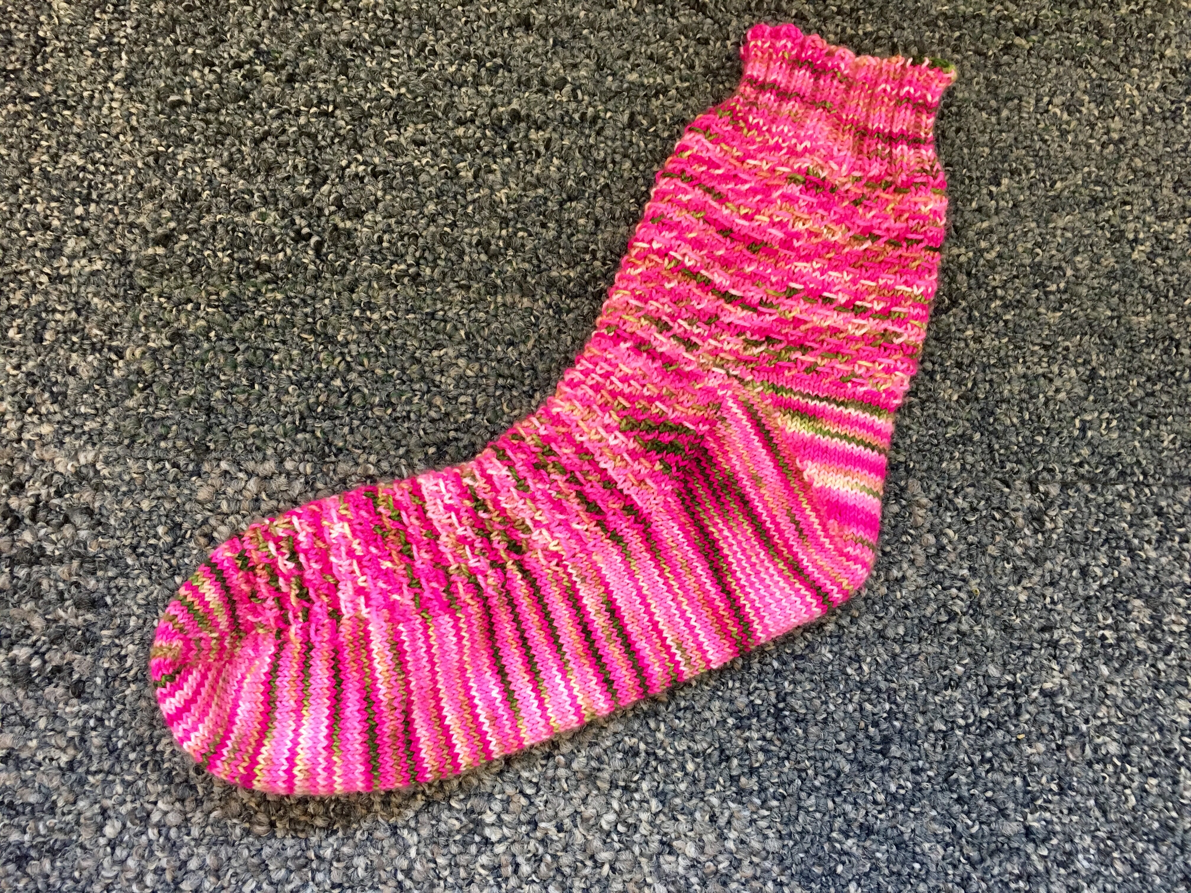 As you can see I finished the first sock. I think it looks beautiful with this combination of yarn and pattern. I was feeling the time crunch and really just wanted to be done so I worked the pattern a few time for the leg and added the cuff. I’m usually disappointed when I make decisions like these. But I think the sock fits great and it’s really an okay length. And I only had a small ball of yarn left…I promise.