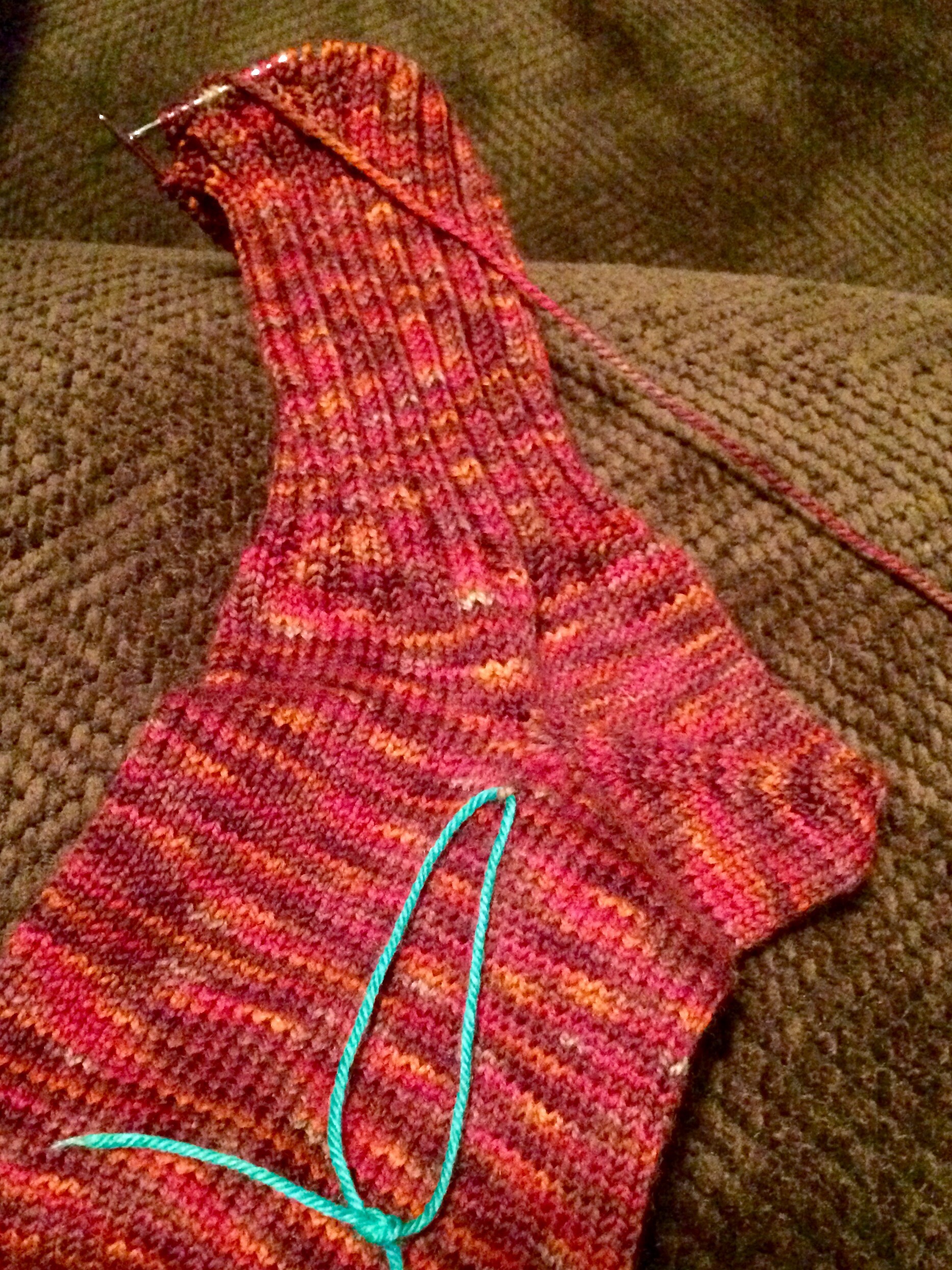 I dropped a stitch when I knit in the afterthought heel. I didn’t notice right away and its dropped down three rows. I managed to stop it and secure it by using some scrap yarn for now. I’m not going to frog back to it, I’ve gone to far and I just want to be done already! My inkling is to ladder the stitch back up and secure it with an extra peice of yarn woven through the purl bumps.