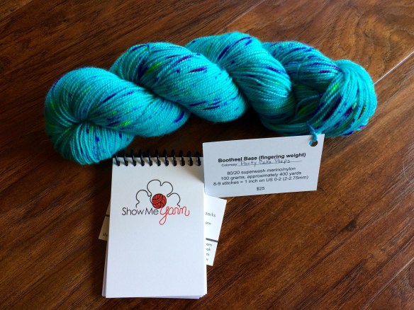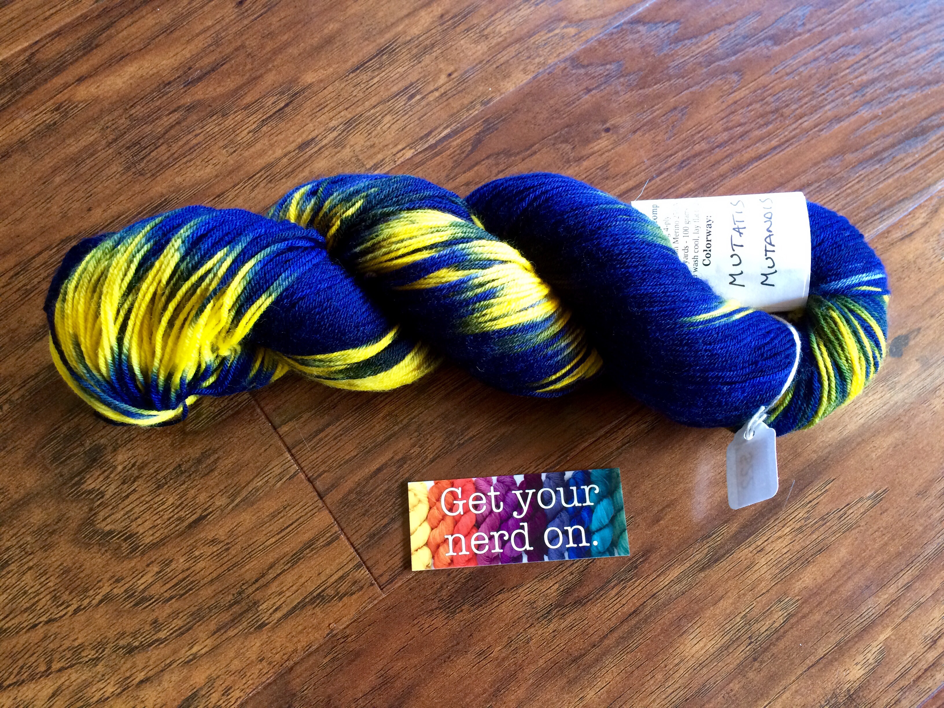Nerd Girls Yarn – Bounce and Stomp in the Mutatis color way. This is a fingering 4-ply that’s 80/20 SW and nylon. It reminded me of my school colors and it had to come home with me!