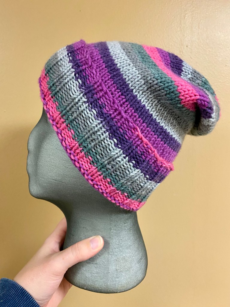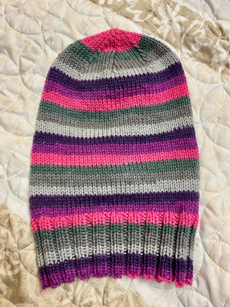 I purposely ended with a complete striping sequence for not other reason than whimsy. I used all but 26 yards of this 218 yard skein. It is a decent sized that can roll the brim or be worn slouchy.