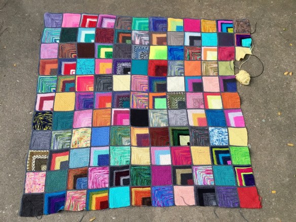 I finished the bottom row with the bamboo Clover needles and the new column of squares with the Karbonz. The metal tips are just what I needed. The cable joins aren’t as smooth as I would like. They catch a stitch here and there depending on what kind of scraps I’m using. I can deal with that (for now anyway).