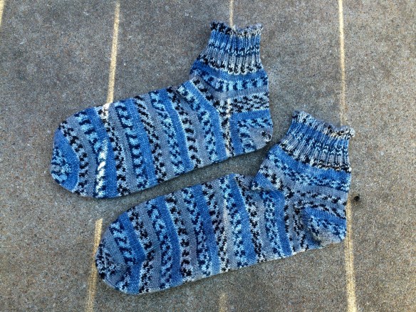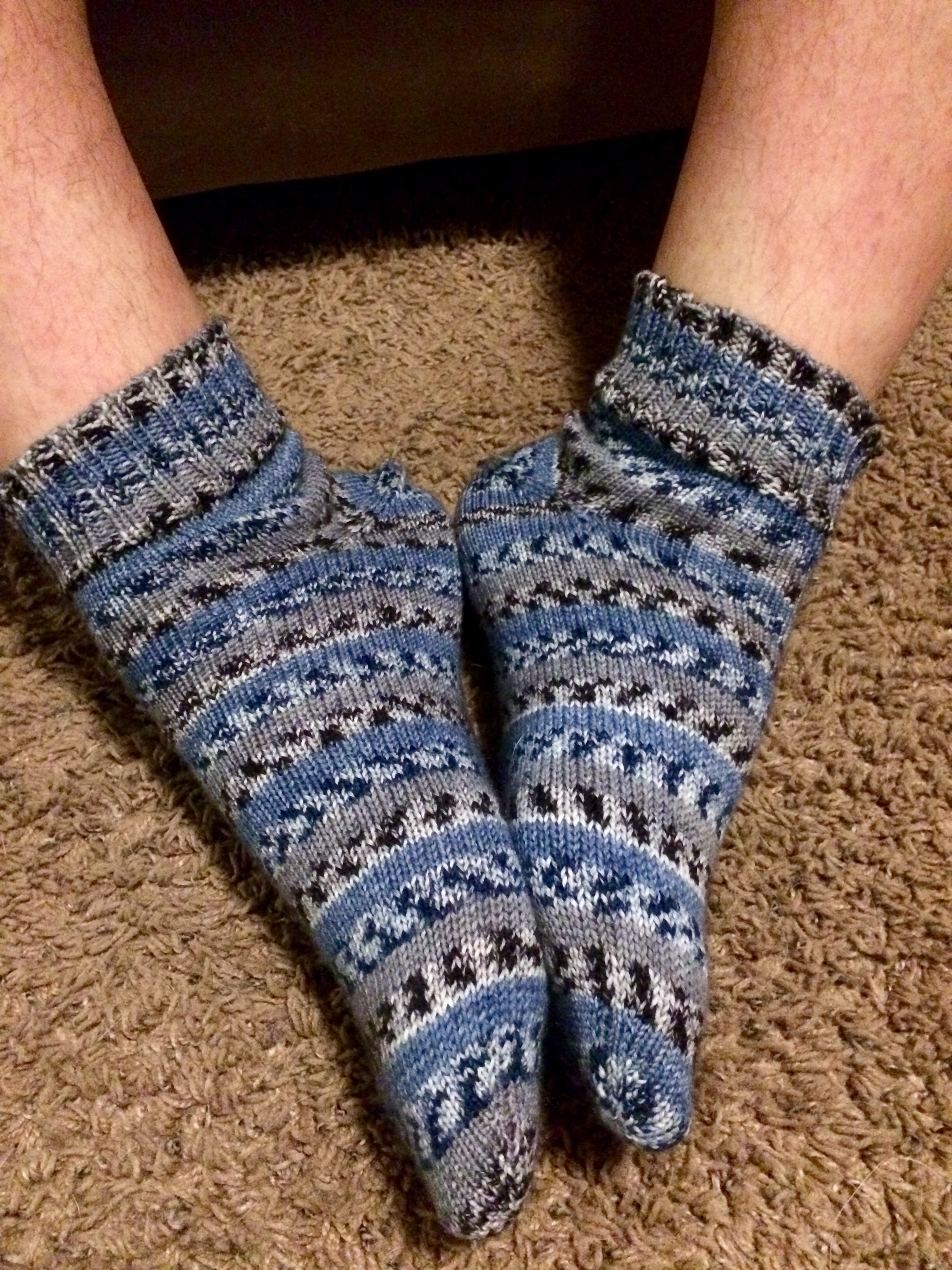 I managed to snap a few photos last night while the hubby was playing video games. (Sorry for the lighting…best I could do). They fit okay. Due to some epic memory loss and lack of note taking…one sock is has an 11 inch sole and the other 10 1/2 inch sole. I can totally tell the difference and my husband says one is tighter than the other. He won’t let me fix it. And I’ve decided to let him have them as is. I’m considering it an experiment to see which level of snugness her prefers.
