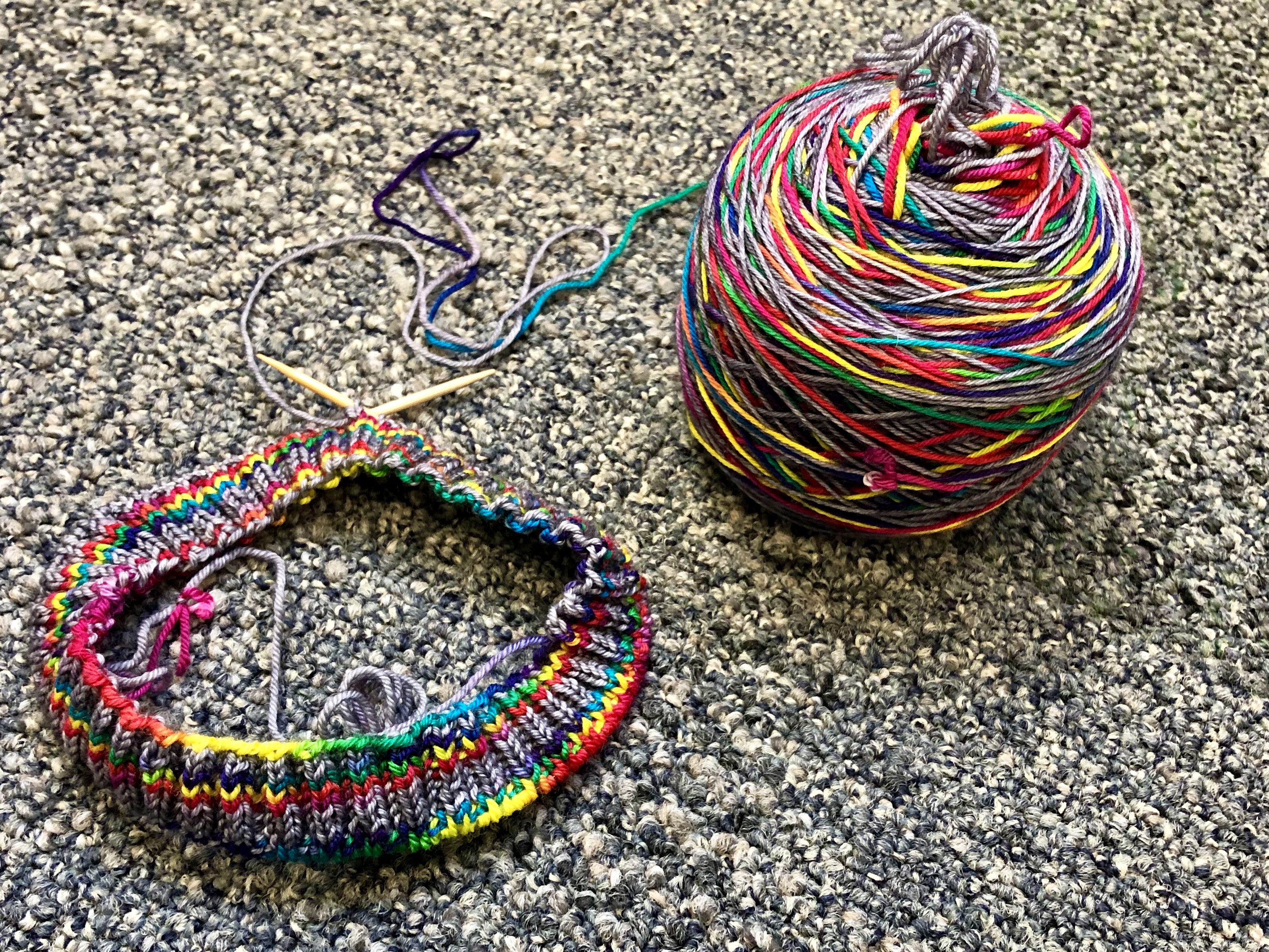 I’m just now starting the plain stockinette part of the hat. So just a ton of round and round for miles. And I’m not mad about it. It’s the perfect easy knitting in a fun yarn to make this time and please a little easier to handle.