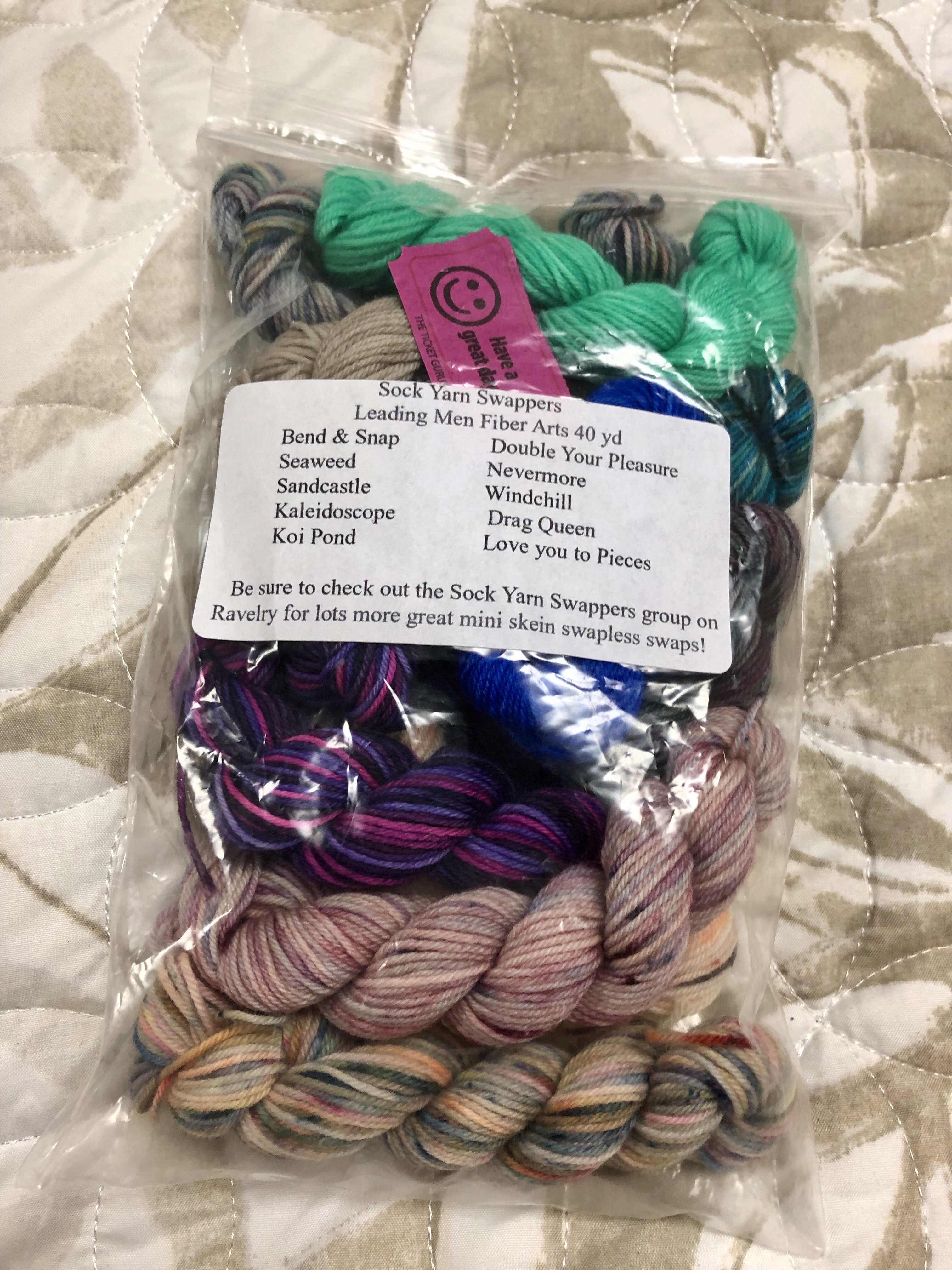 In total with the self striping and the contrast heel, the socks weigh 75 grams and used about 280 yards of yarn. The mini skein had a teeny tiny ball left but was almost completely used up.
