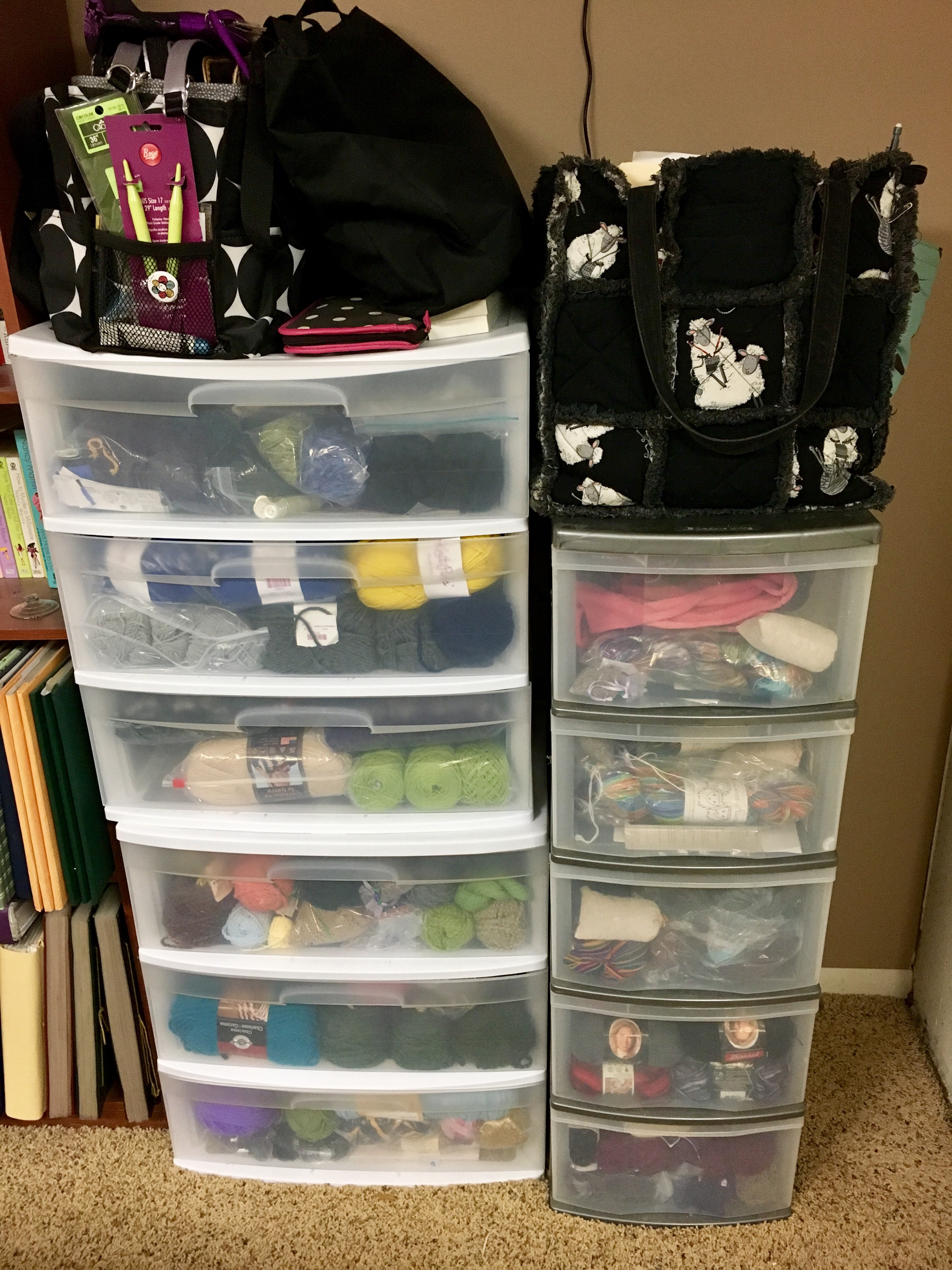 And got all the yarn to fit into my plastic shelving. Literally my whole stash is in this photo…bags, needles and all! I even managed to identify four skeins to de-stash!