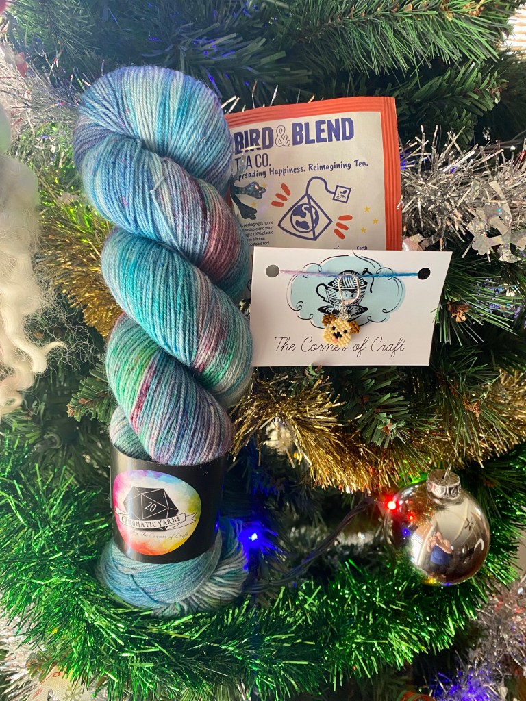 I snagged a skein of Chromatic yarns in Sturdy Sock called True Sight. Also a cute little puppy hand beaded stitch marker. Hannah also throws in a bag of bird and blend tea. This one was a fruit and custard herbal tea.