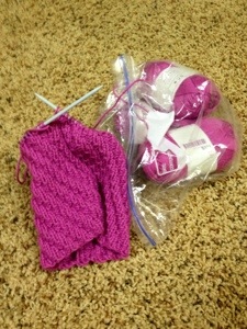 And finally Stashbustin’ #24, Spiral Leg Warmers. I went all out for this one…yep that’s right that’s a zip lock bag holding my yarn. Not fancy but keeps thing dry and clean!