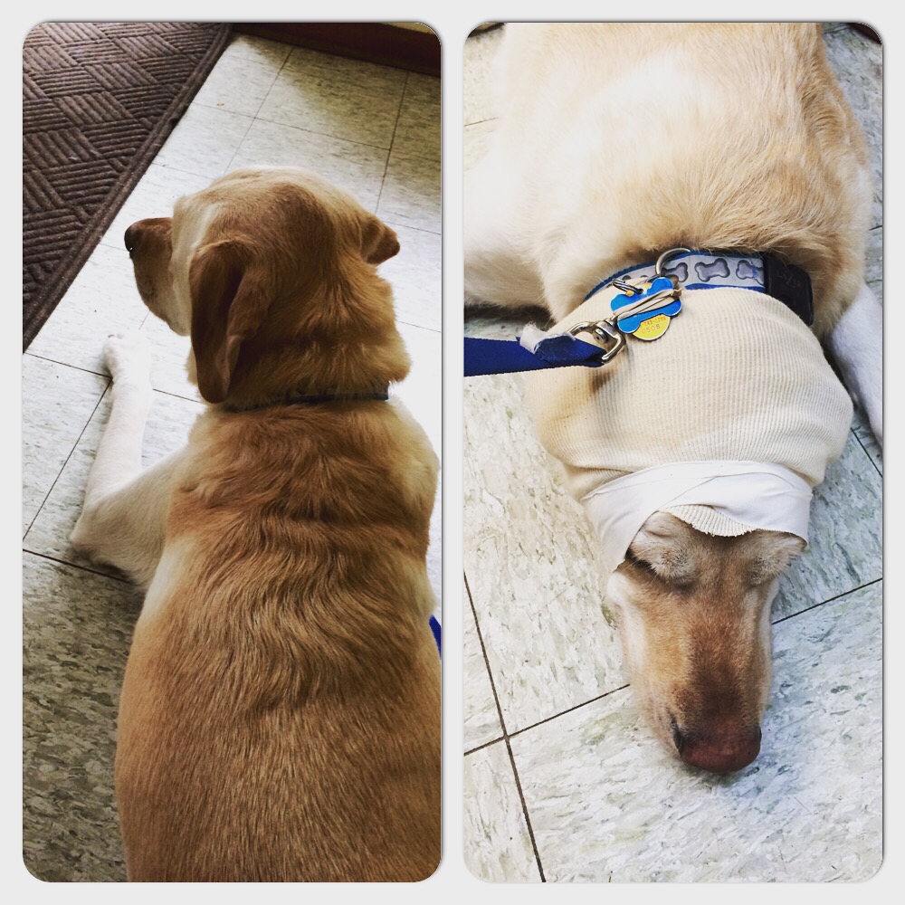 While visiting my parents Dex developed soreness/pain while jumping up and down from surfaces. He yelped/cried when he tried. Not finding any outward signs of injury we kept him quiet for a few days to ease what we thought was probably a pulled muscle. And for most of the week he continued to show no interest in jumping up and down off the couch or bed. He did absolutely fine running, eating, drinking, and playing.  Then last Saturday came…