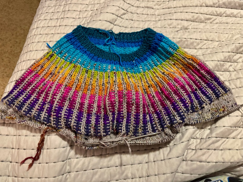 After some fiddling and a few dropped stitches, I have my Rainbow Radiate ready for sleeves!