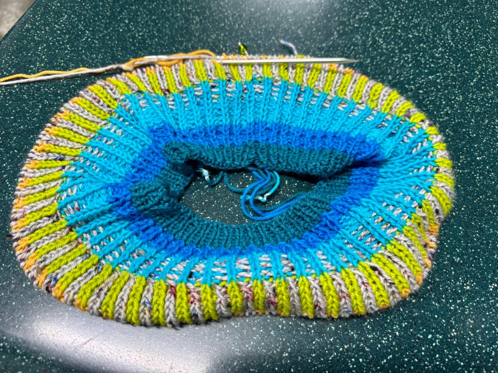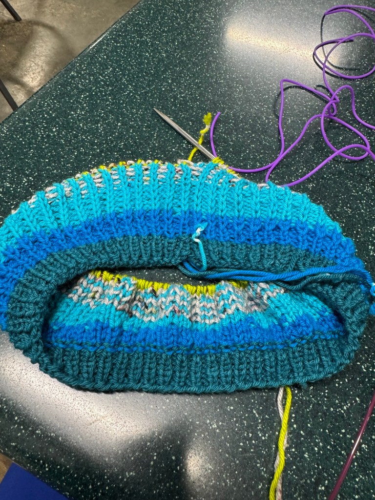 I am glad I went back and corrected the stiches that were bothering me. The rows are long now that I have fully increased for my bust but the rainbow is worth it. I have three more colors to add after this hot pink. So I am CLOSE.