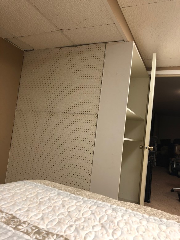 My craft room AKA the basement guest room recently got a BIG face lift. This room never had a closet and had ugly peg board and shelves covering the furnace. It was hard to access to furnace in addition to being an eyesore. My absolutely wonderful father and husband rolled up their sleeves and got to work.