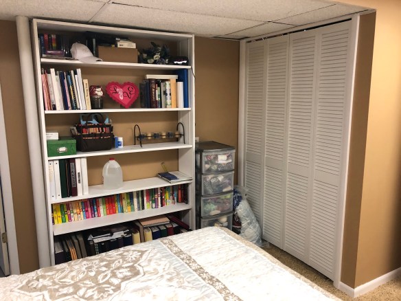 The furnace area got louvered bi-fold doors and a new sheet rock wall where the shelves were. The shelving unit was re-purposed and moved to another wall. We added extra shelves to make them more useful. And the old craft shelf was moved to the laundry room for extra storage.
