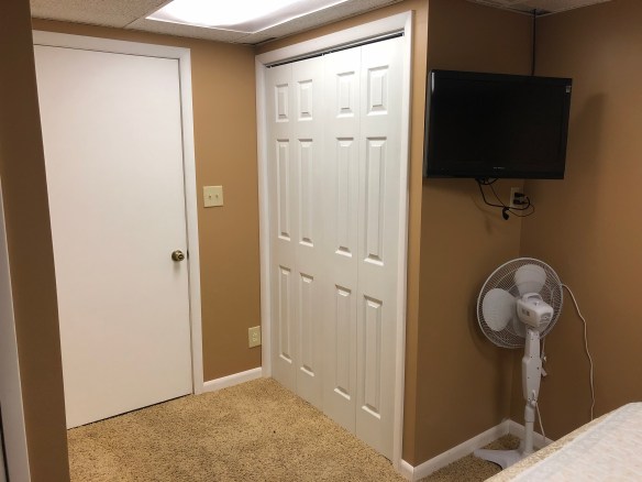 But best of all, we put in a closet!! Now I have a closet to store winter coats, yarn boxes and craft supplies out of sight! It also made a nice place to put the guest TV. My mom likes to be able escape the kiddo chaos to watch her shows when she visits.