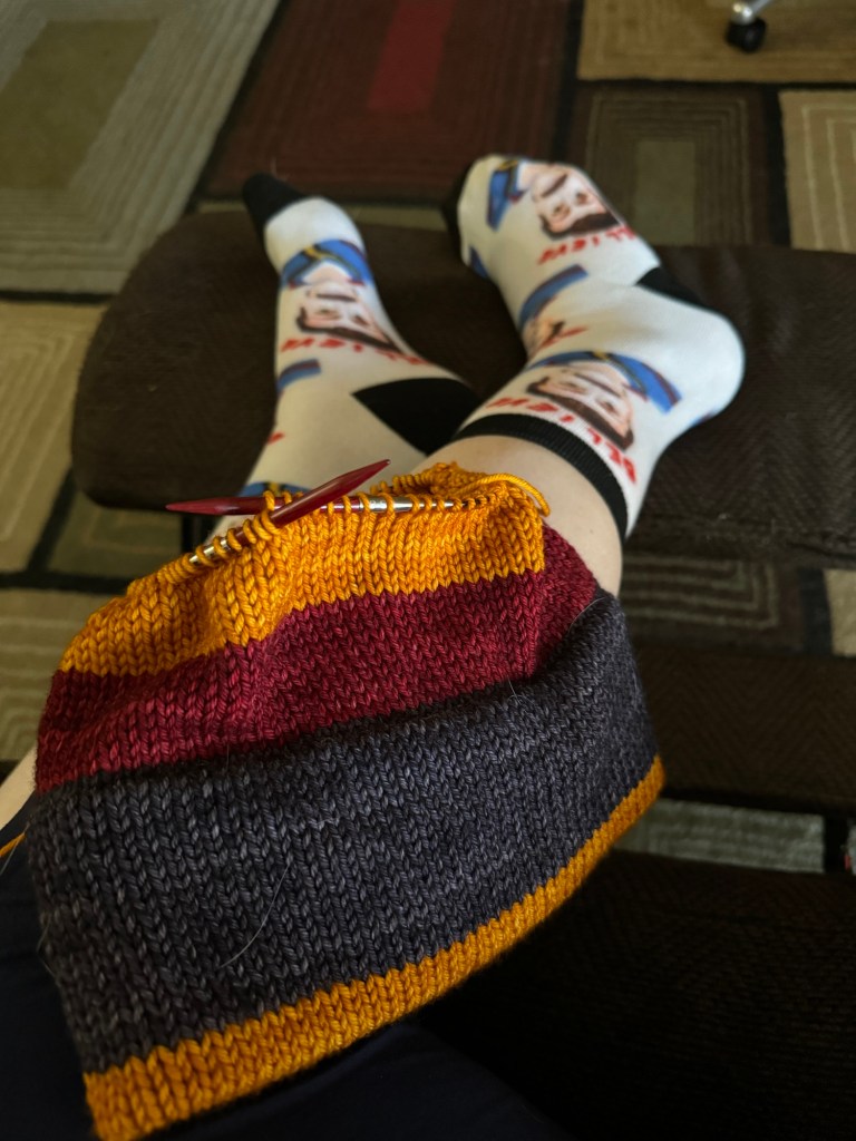 I have normalized knitting with my work folks so as long as it’s not distracting, I knit all the time now! Happy Knitting!!