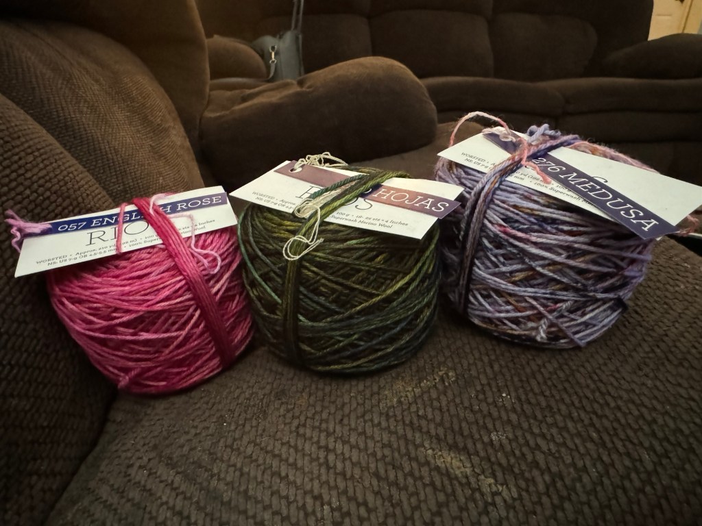 I picked up a skein of Malabrigo Rios at the Studio in the colorway Sunset. I thought this gold/orange color would make a great compliment to my Chiefs Hat #4 colors. I have that one finished and will show you tomorrow all the glamour shots. I started with the Pearl Ten grey for the lining and then moved into the Sunset. I am just now adding the red/Sealing Wax color.