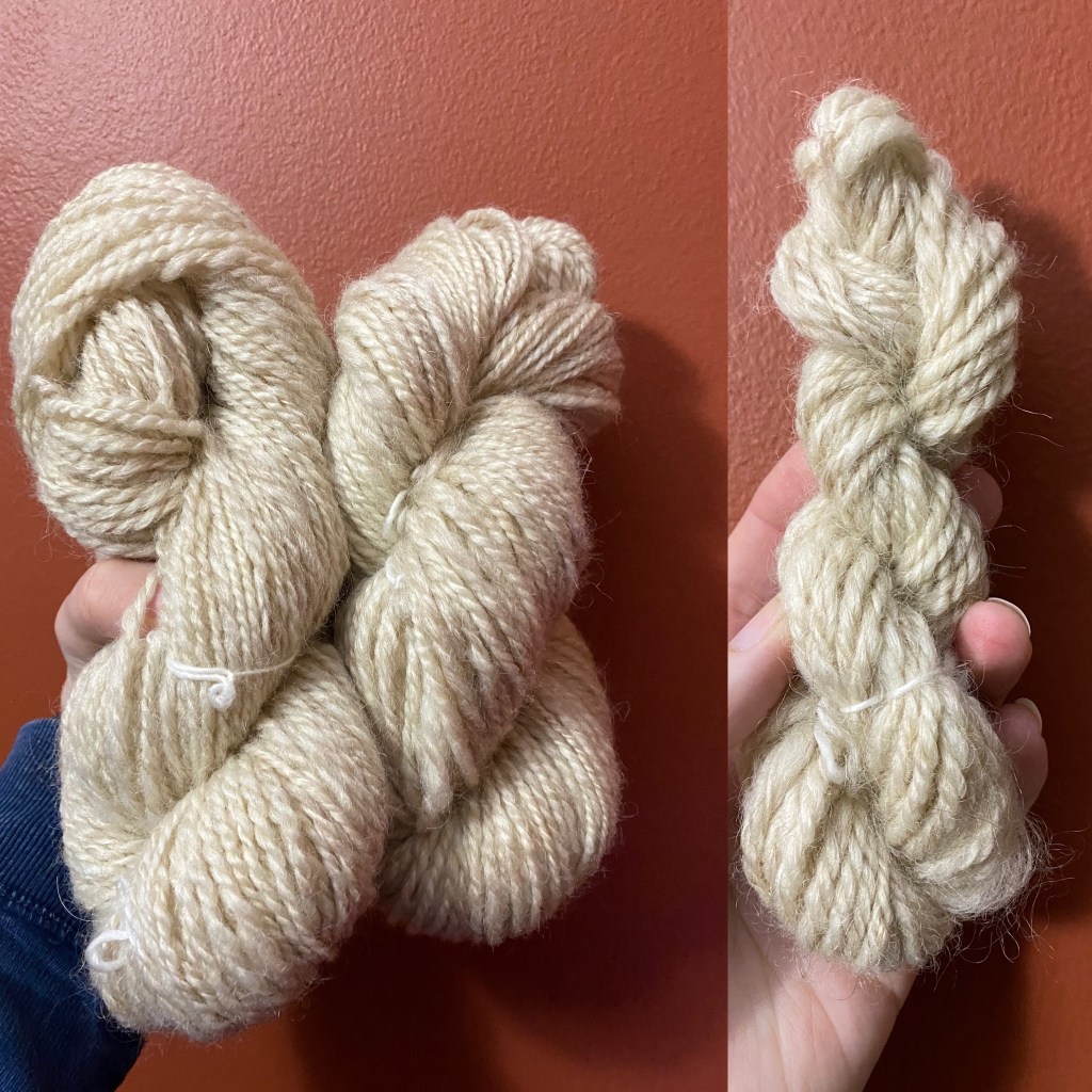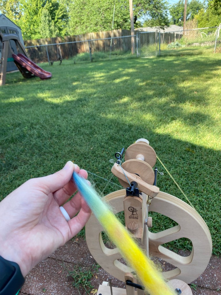 This fiber is a mix of blues, yellows, greens and eve some pinky orange. The singles came out nice and easy. It’s getting easier to get a finer single but I still struggle with pieces that come out thick where the fibers might be a little felted or clumped. I am able to fix some and some just go through as “character”.