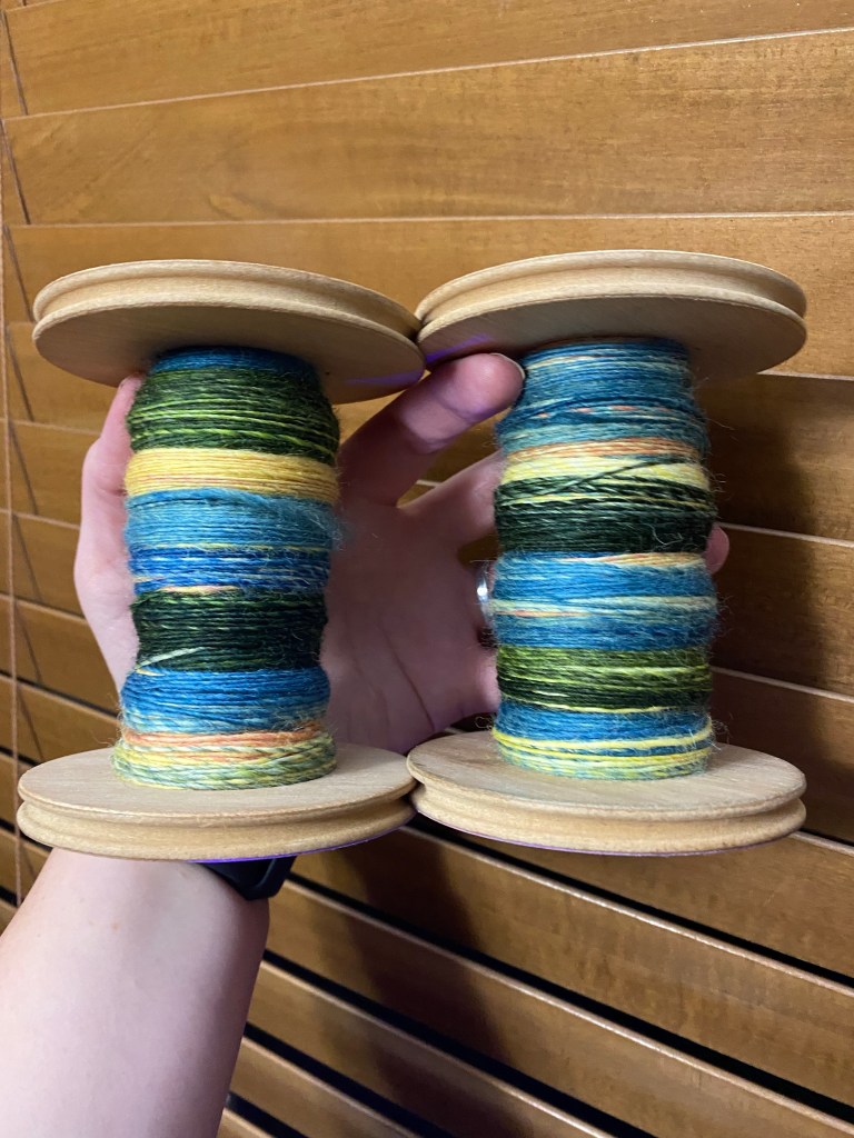 It turns out I am getting better and faster about going through four ounces of fiber. My 100% romney in Waiting for Daffodils colorway has found its way onto two bobins.