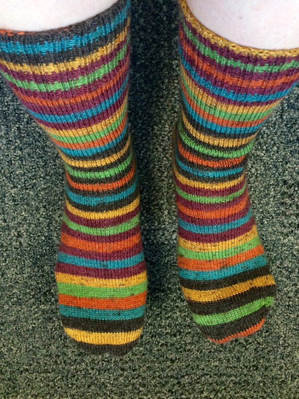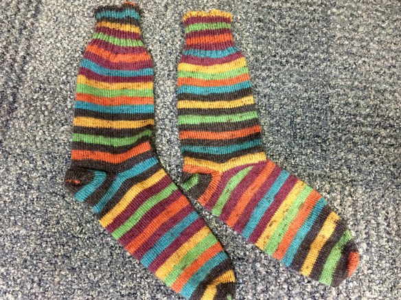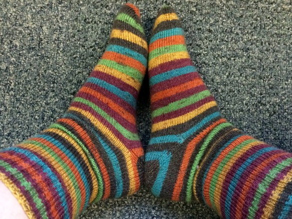 I have been collecting sock leftovers in a nice neat bag and in my 2016 Wishlist I wanted to knit Jellybean some tube socks. I have been mulling using Jasmin from the Knitmore Girls Genevieve’s Tube Socks. I had the yarn and the needles and took off. I pulled the Saki Bamboo from my Conference Vanilla Socks in crayon box. I had 20 grams left and divided it in half.
