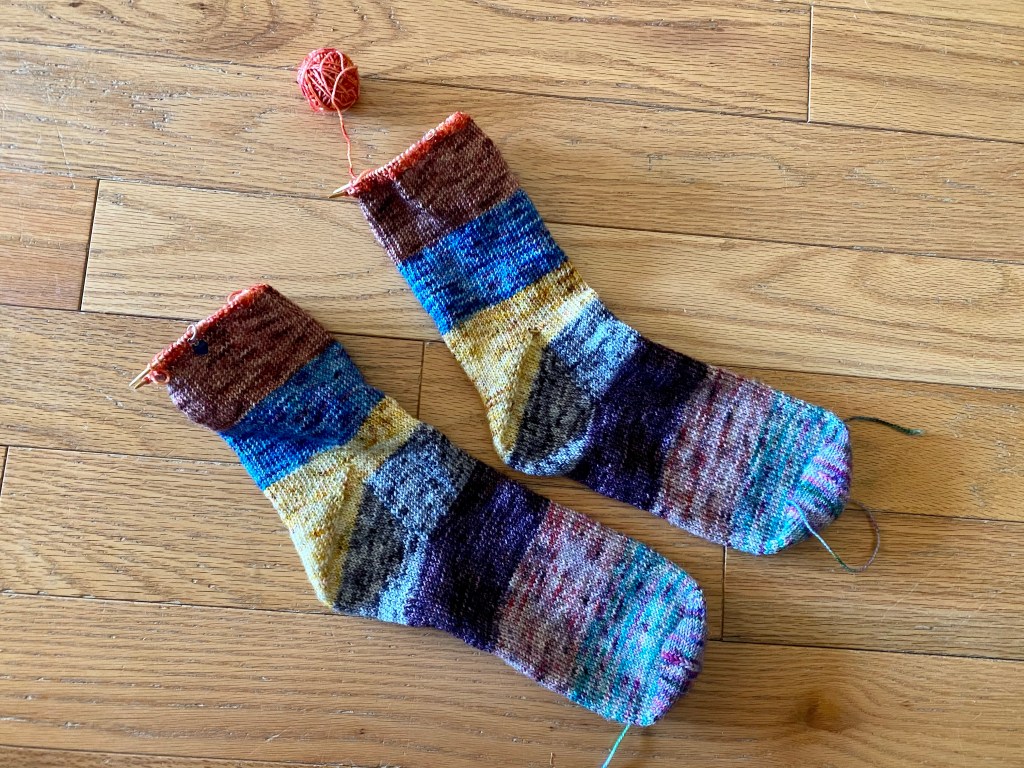 I am feeling all the mojo for these socks. The second heel is in and I’m cruising up both legs. The yarn is staying fairly well matched after my painstakingly splitting the minis as close to in half as possible.
