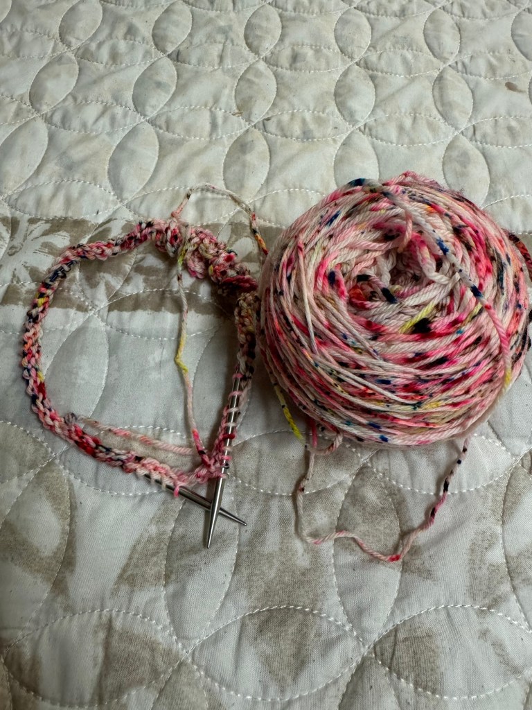 This is a Malabrigo sport weight yarn. And while it does take more stitches and longer to knit, it sure does make a nice fabric. And in this color the speckles are spacing out quite nicely. They are random but even and that makes my brain happy.