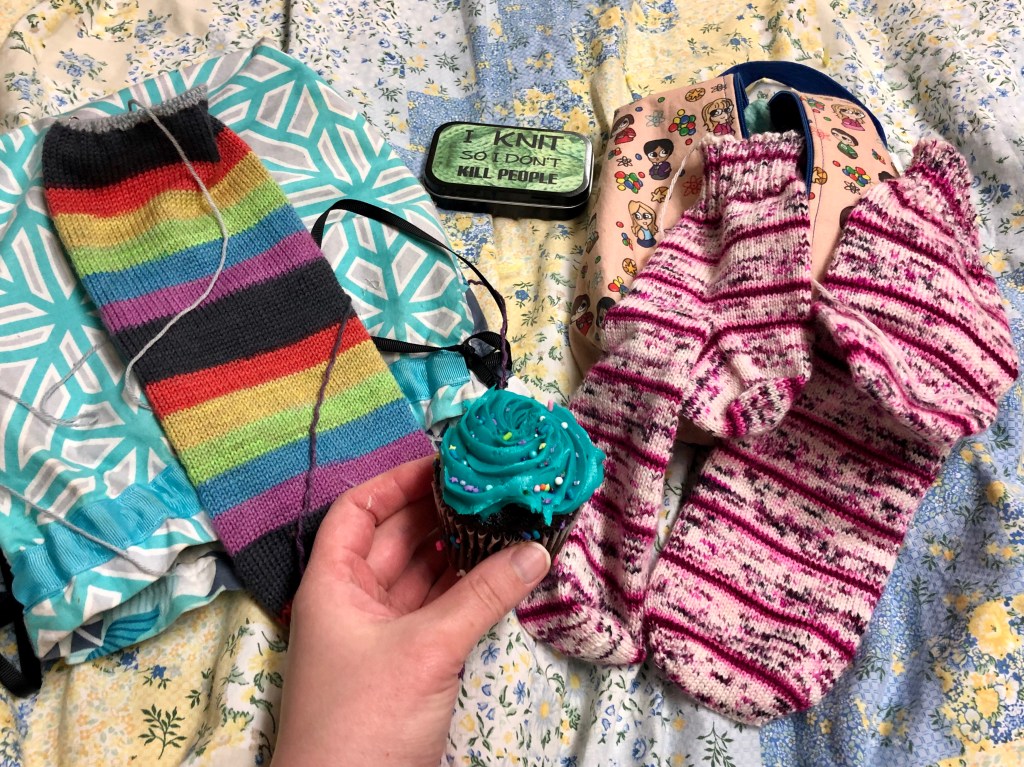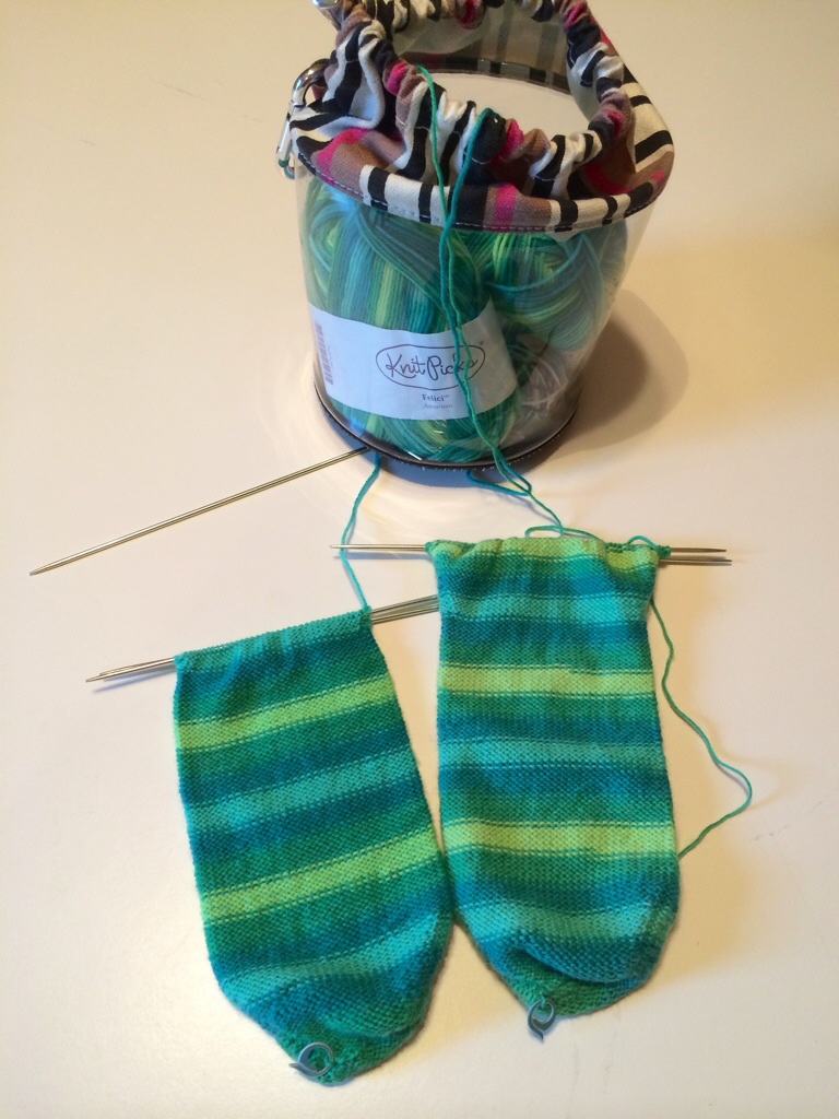 Welcome to my happy place…..self striping yarn! My Carbon Sprinkles Vanilla Socks well into production of sock number two.