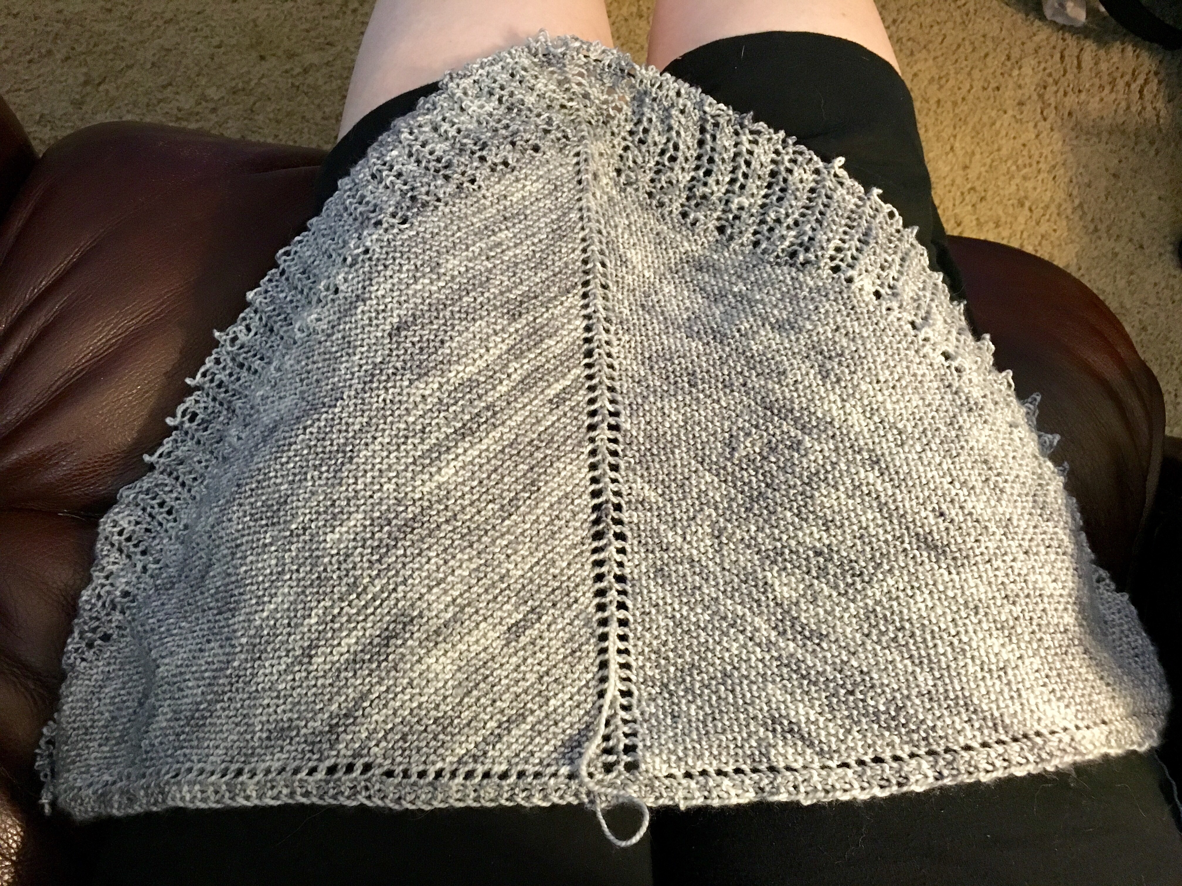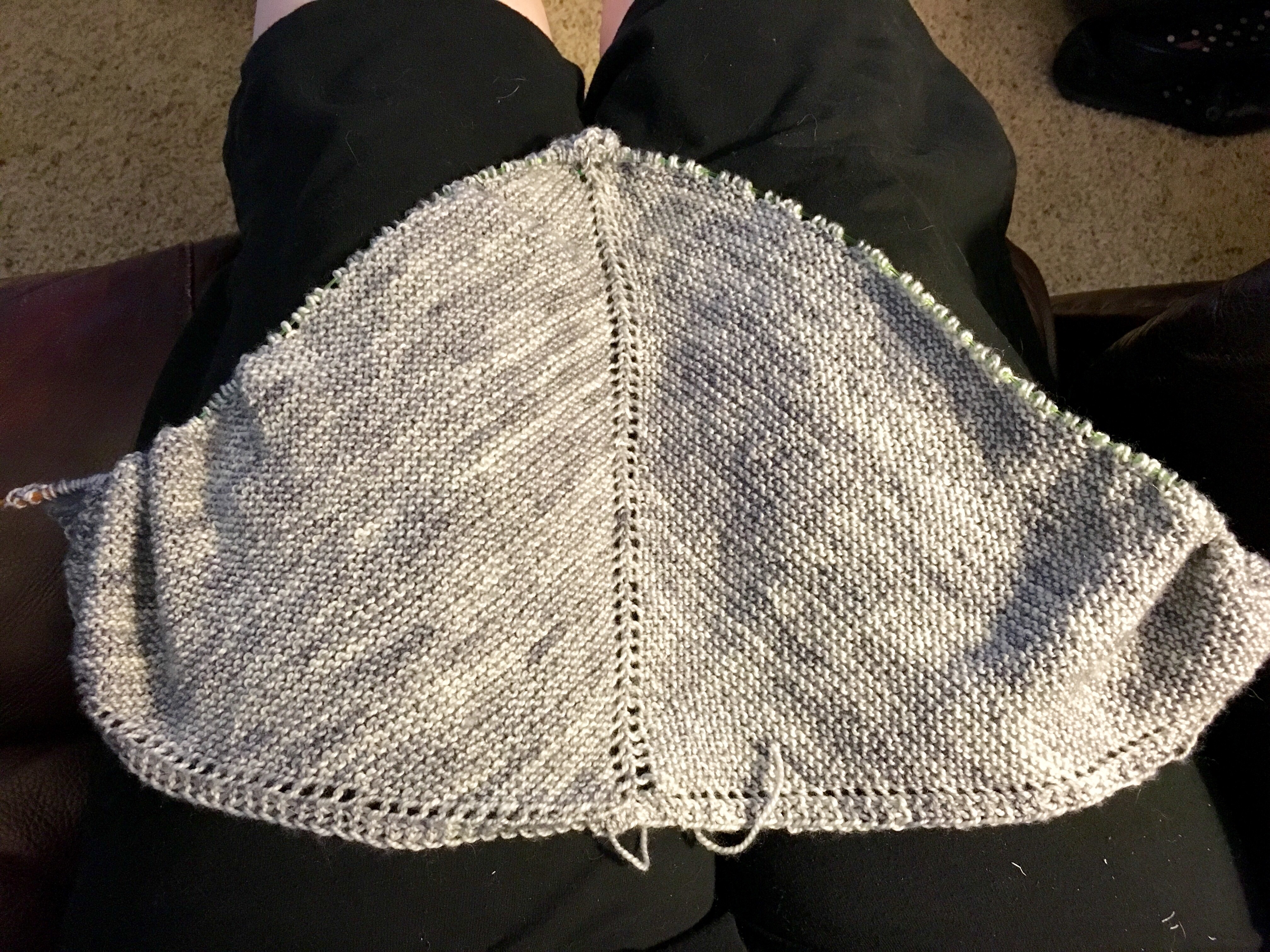 - Cabin Shawl by This.Bird.Knits – this is an easy triangle shawl written for exactly the yardages I have in each color. But it’s not looking like an easy one to wear/style on the body.