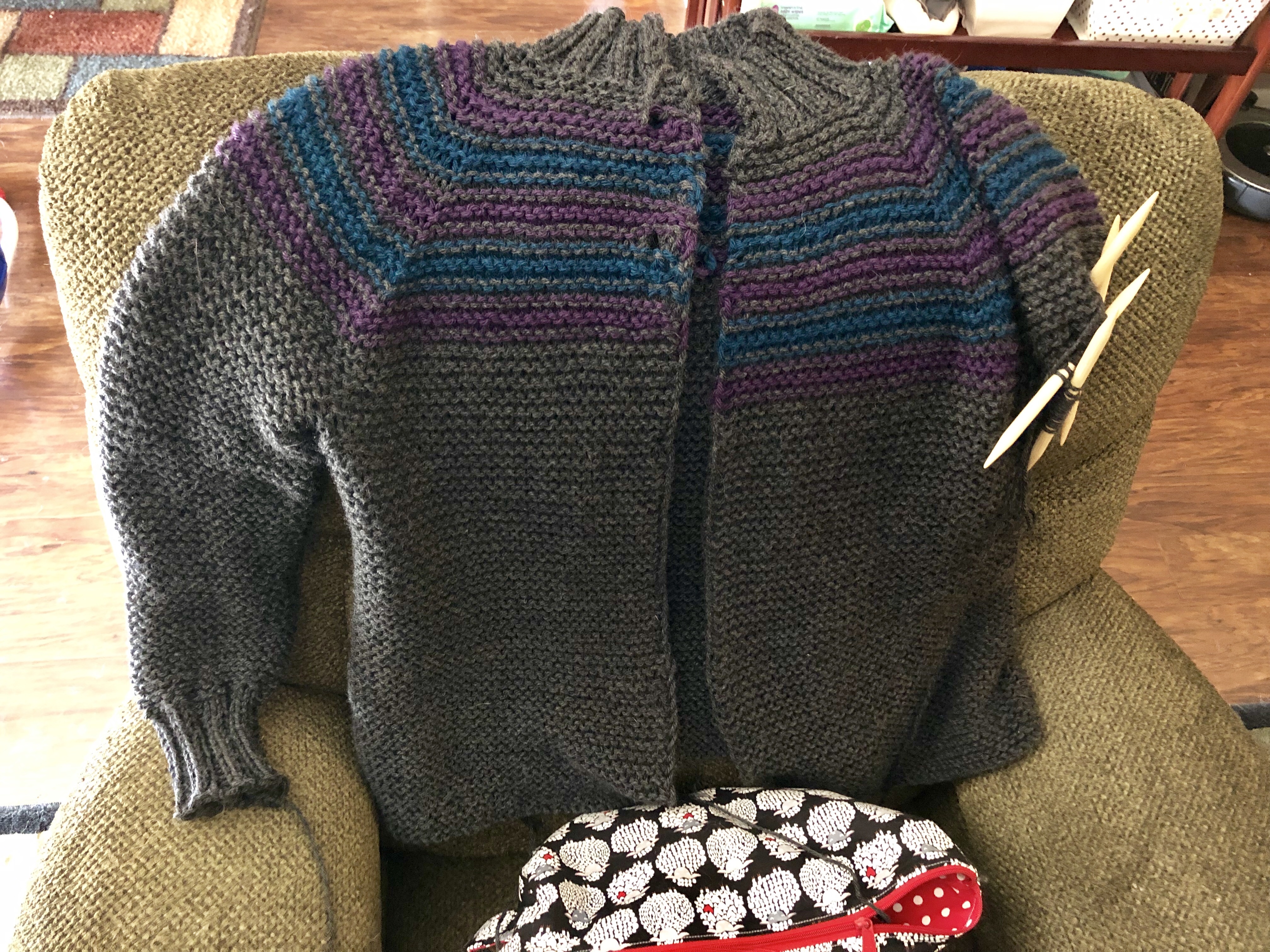 I was a good chunk through the decreases on sleeve one so I hunkered down and finished the sleeve. Purling in the round on huge US 13 dpns….NOT my favorite but I was committed.