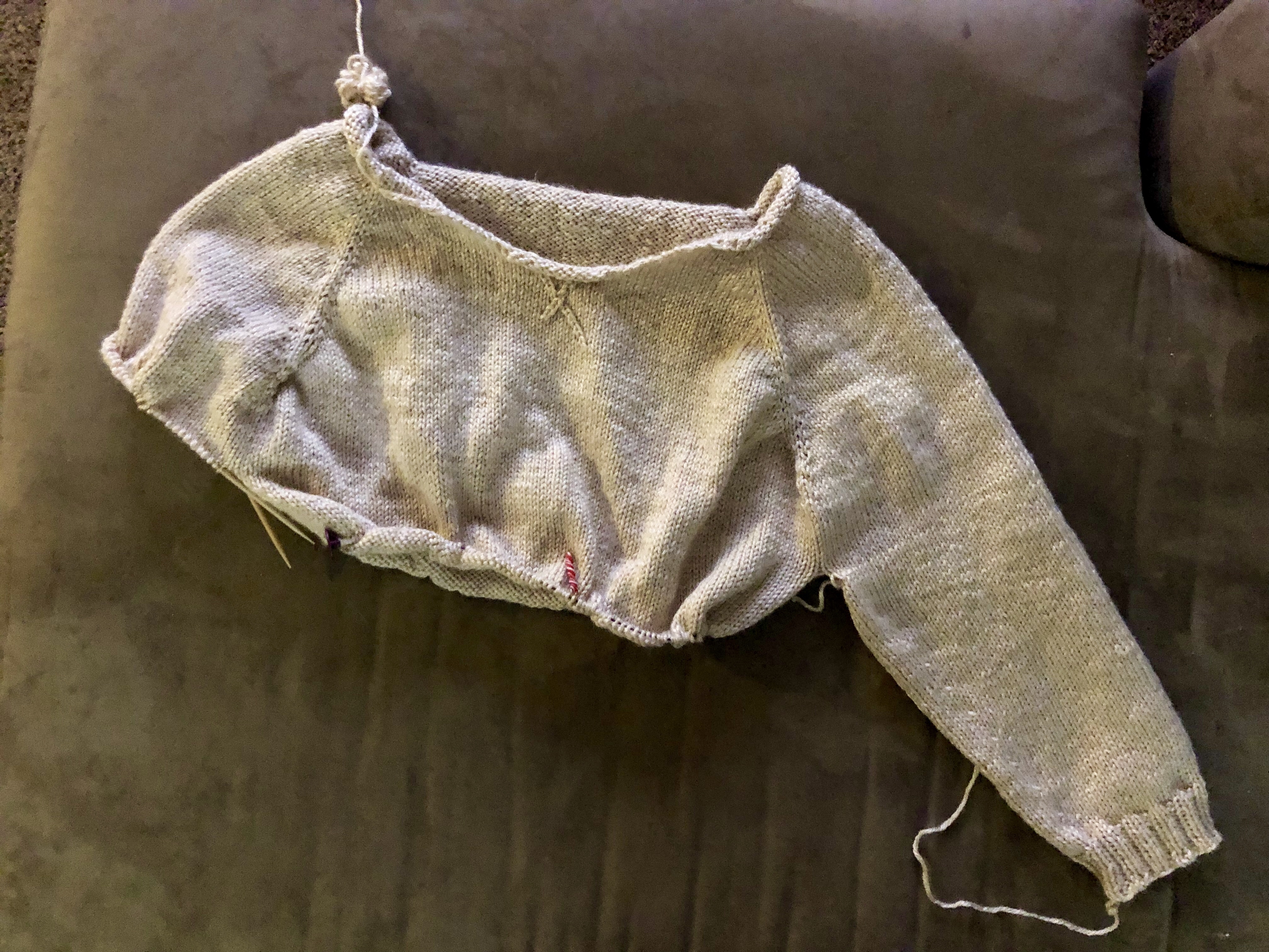 I sat patiently in the winter sunlight and put my needle back in just past the sleeve cap where the arm started and RIIIIIPPPED back a whole sleeve. Based on some fussing around when Jellybean was wearing this I need to reduce the stitch count by about 1/3 to just under 1/2 over the course of the arm.