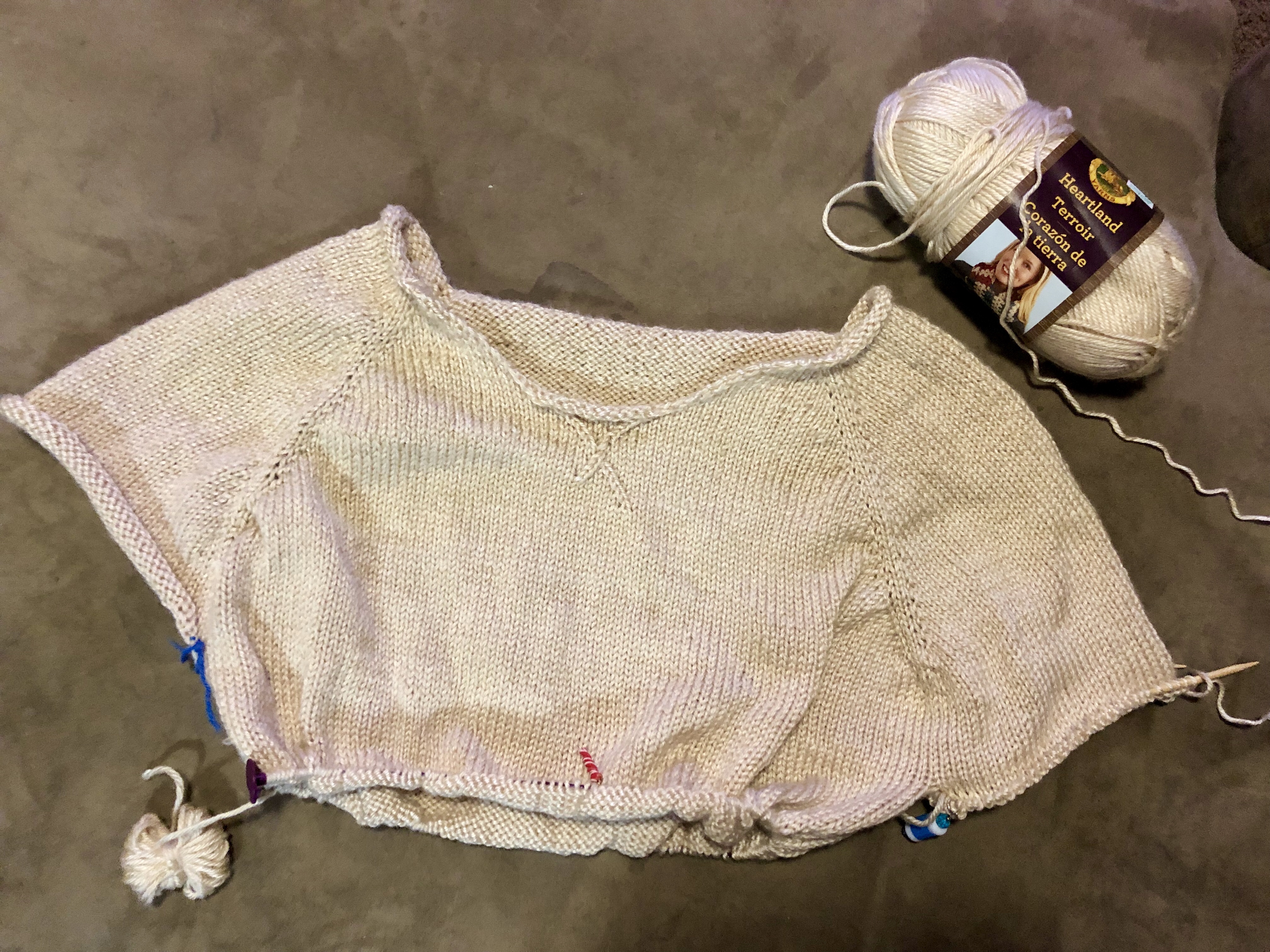 On Monday I had managed to achieve sleeve separation and knit down a few rows. I did sneak away, despite my family’s best efforts, to a local Joanns and grab as 16 inch circular needle in size 7 to start my sleeves. I really think I’m going to be happier if I knit the sleeves without having to turn the entire body of sweater.