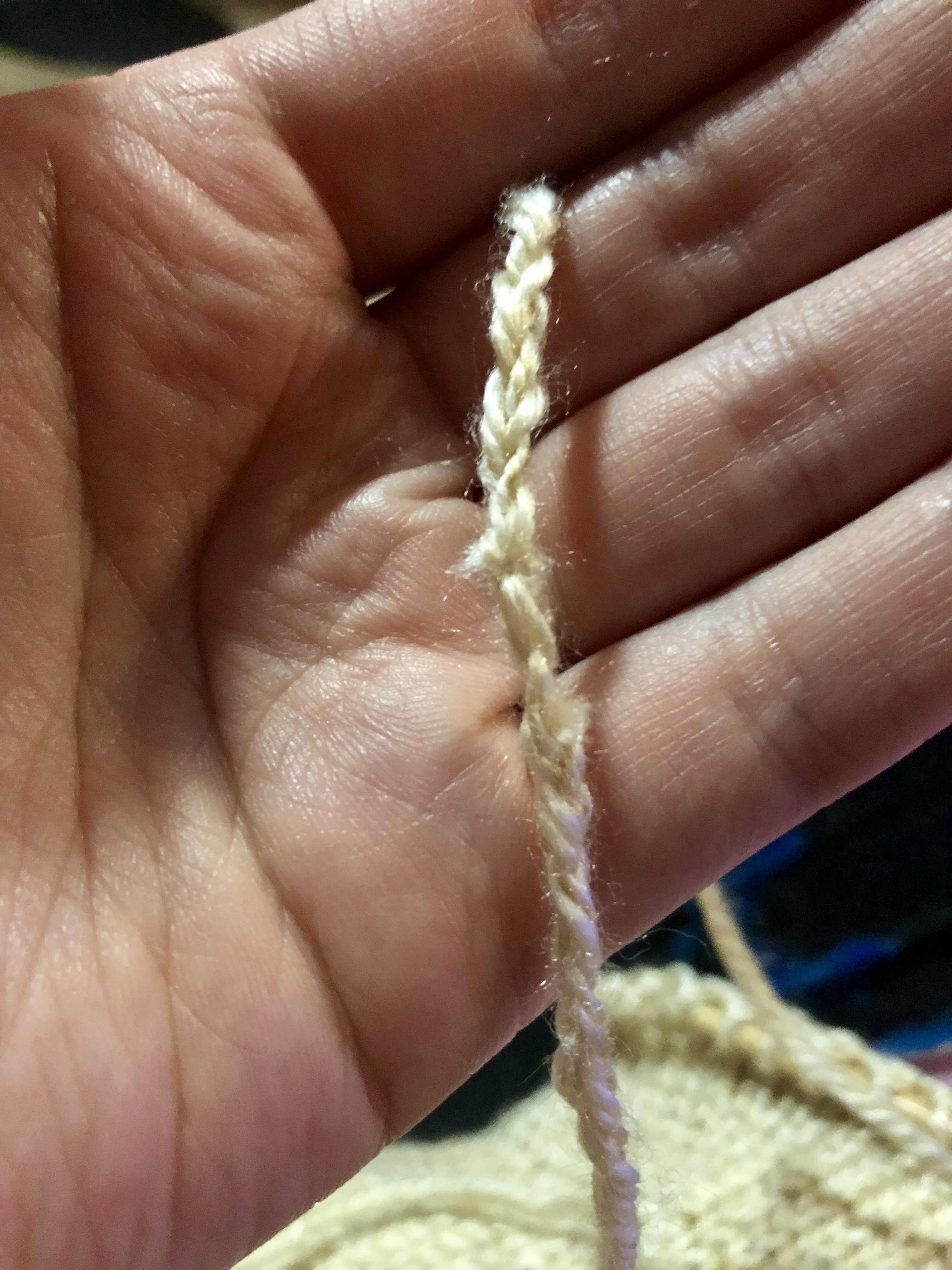 I pulled out my took kit and decided to fix the problem. I cut the knot out and then loosened the four plys on each end of the yarn. I then cut two of the four plys off each side and used my tapestry needled to do a Russian join.