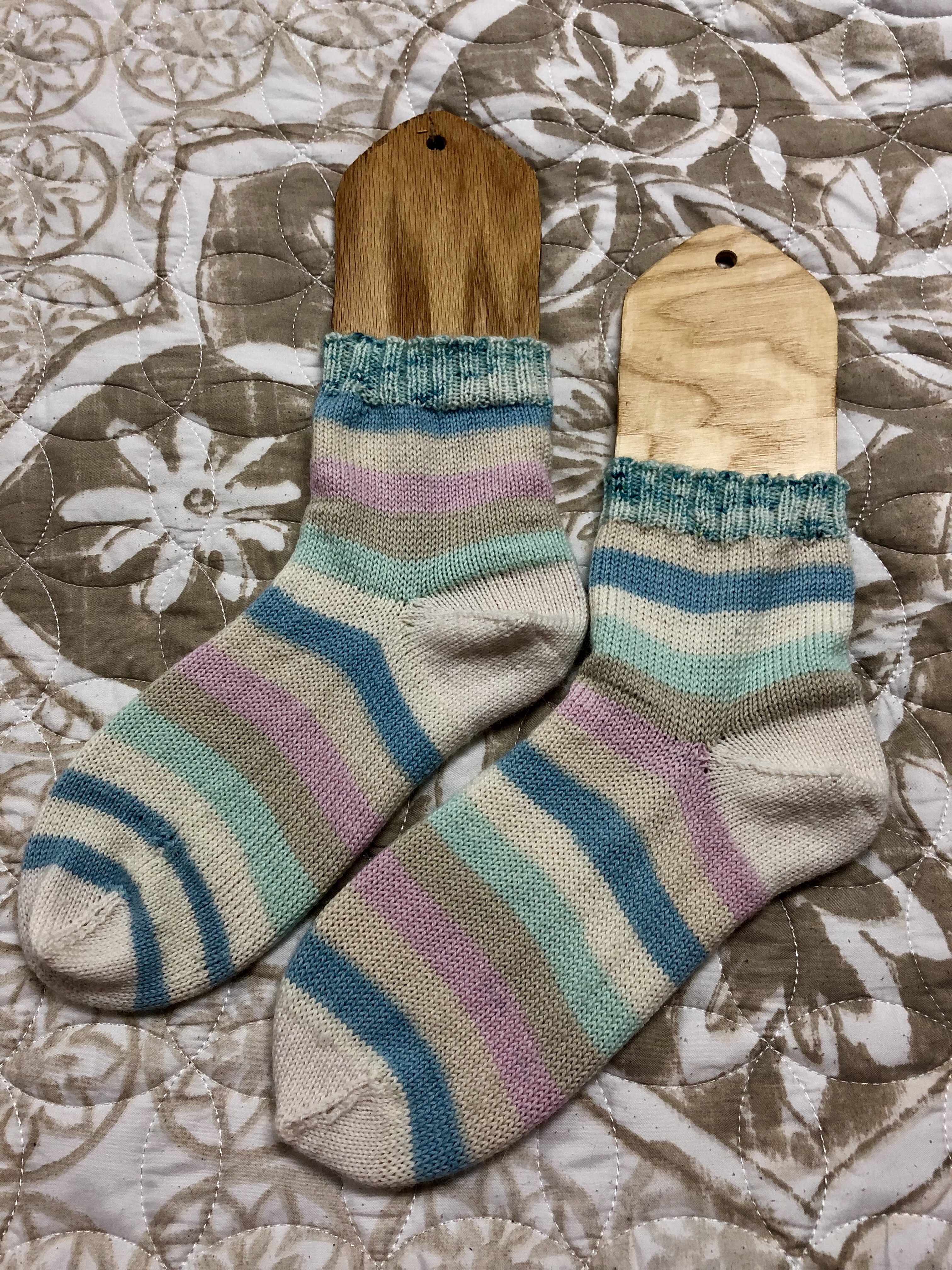 These socks are one full 50 gram skein of the Felici split between two socks and then roughly 25 grams of the Cascade sock. I definitely didn’t split these evenly and one leg ended up longer than the other. You can see that one set of cuff ribbing is about double the other one. So the socks are now equal in total length but not in ribbing. I’m rolling with it.