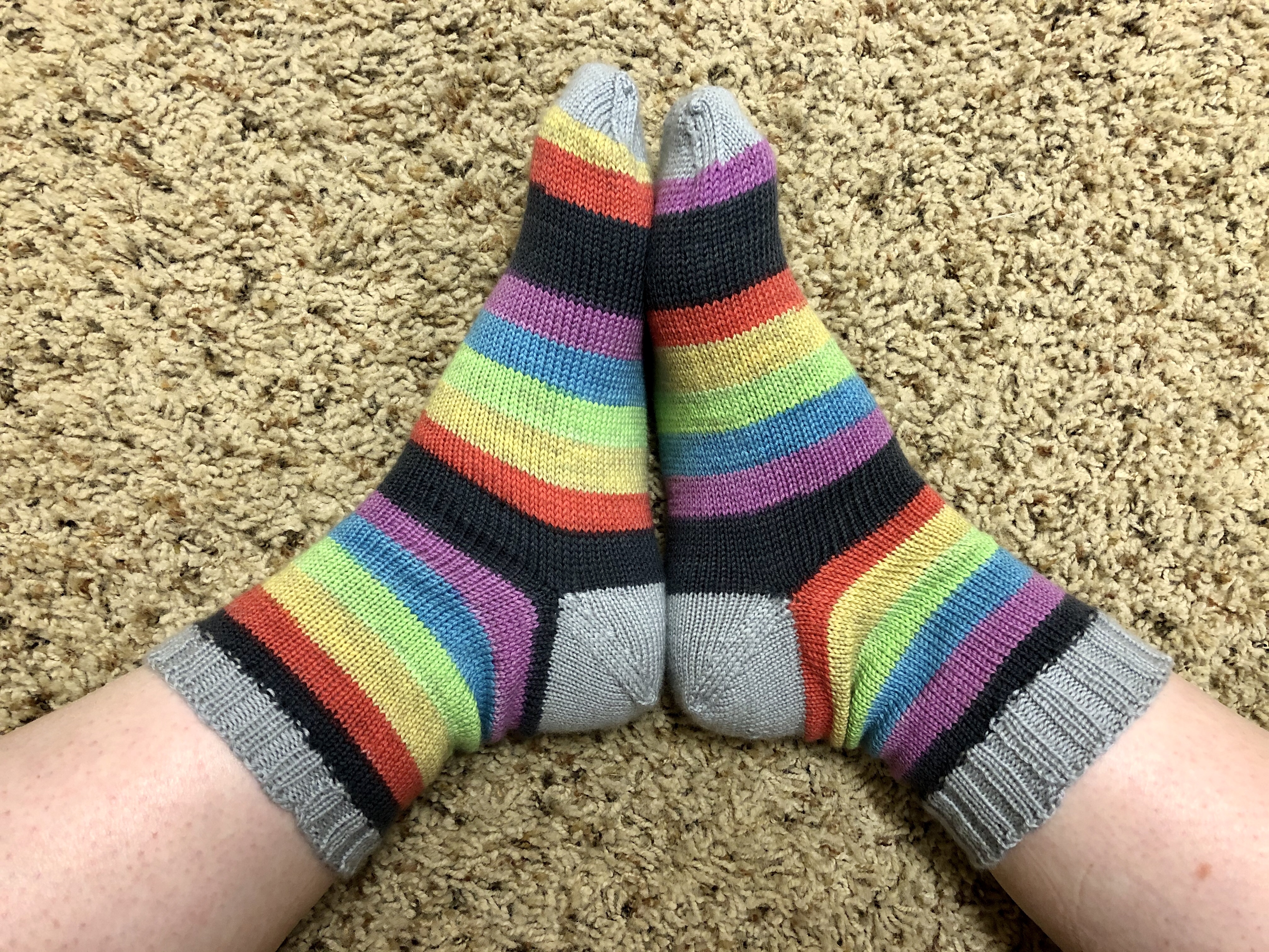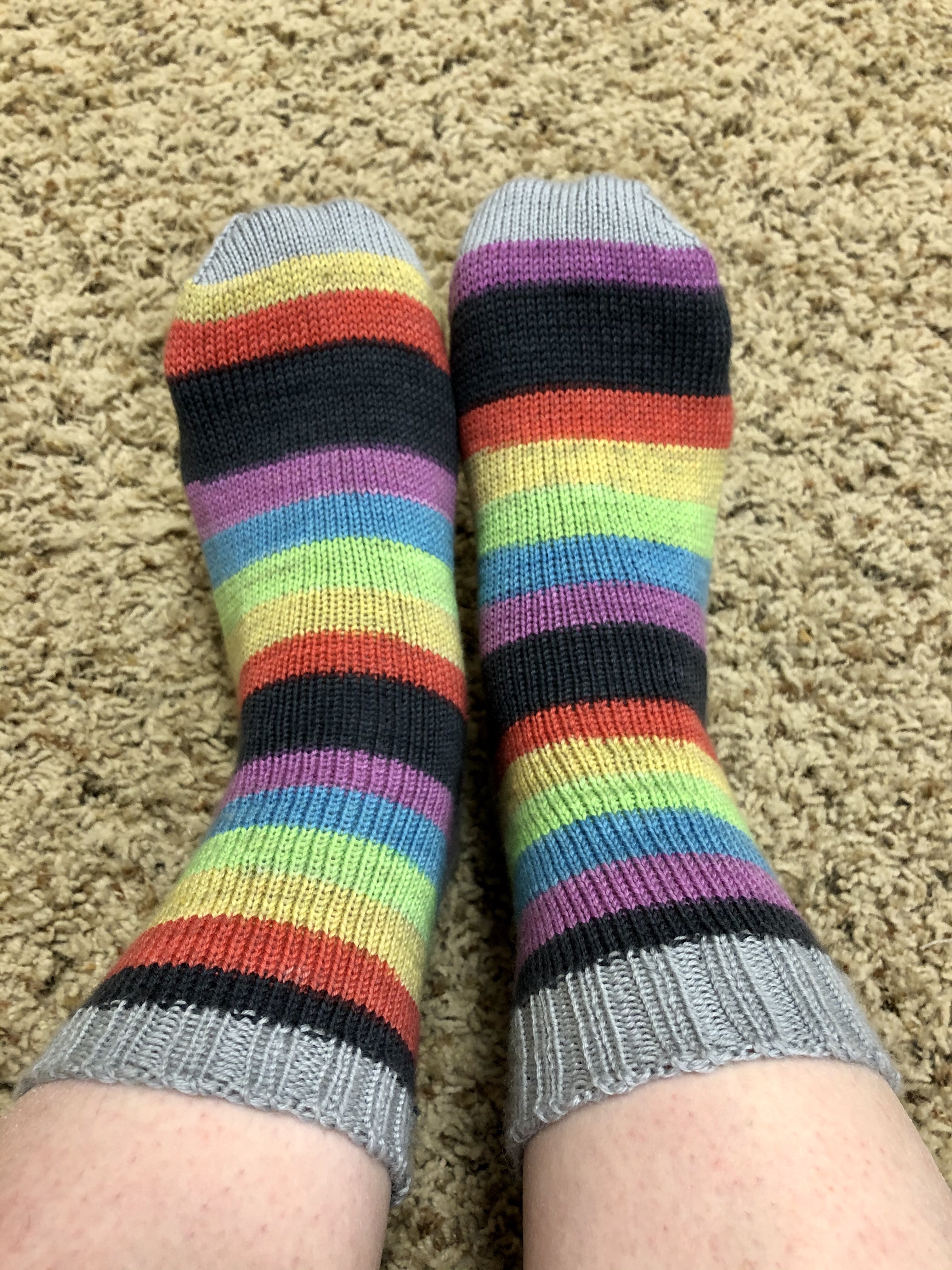 And as pointed out so very eloquently in the comments of a previous post. The stripes are reversed because I knit toes from both ends of the sock snake so when I split in the middle they became opposites. And you can totally see that because the red and purple stripes are exactly opposite one another in each sock.