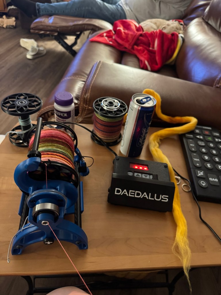 I decided to break out my Hitchhiker spinning wheel to ply my 2025 Pigskin Party spinning project.