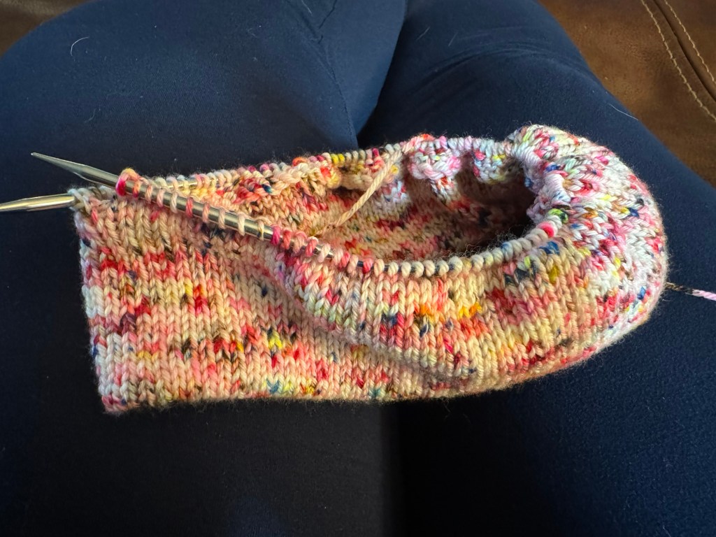 When I got it back, I realized it was in fact NOT worsted and actually a sport weight from Red Door Fibers that I picked up from KITH KC 2024. I decided to roll with it. But that meant stopping and doing some calculations to adjust stitch count and needle size for this weight of yarn.