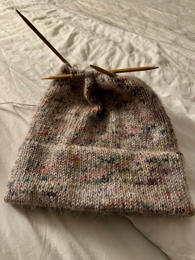 After some maths, I landed on 112 stitches on US 5s. Still thinking a stockinette folded brim followed by a vanilla beanie style. This hat is going decidedly slower with the smaller yarn and more stitches. I think this will migrate to being my work backpack knitting and therefore a slow and stead progress kind of project?