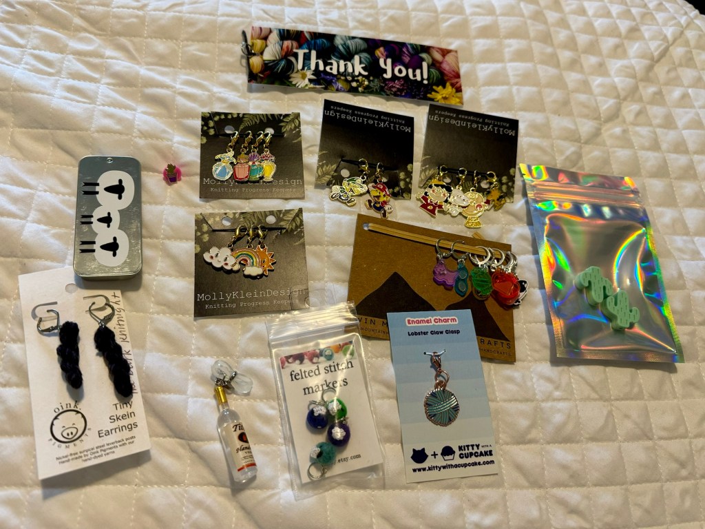 I did manage to stay within my budget and go home with a little cash. But some of that was because my mother stepped in and bought some of my yarn. I got a new to me dyer Apothefaery Fabrications in her Delightful DK base in a speckle green color for the Baby Vertebrae. I purchased a stitch marker set from Th’Red Head Yarns and its a sheepy themed set. My mother got a BB-8 themed bag from Aunt Stephs Handmade Gifts. She thought Jellybean would like that. My one “just because” purchase was some Knitty Bits 2 sock yarn from Two Windows Dye company in a yellow stripey colors plus some assorted minis for my scrap blanket. And last but not least I hit up a favorite yarn dyer, the TreasureGoddess yarns. I picked up DK treasure skein in Song of the Siren for the Half Theory hat and a gradient set in greys in the Cashmere Super Toes base for the Knitting at the Library Cowl. They even through in some pirate sheep can koozies with our purchase.