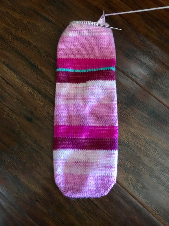 I saw on the Ravelry boards for the Down Cellar Studio Pigskin Party KAL that the November interception involved self striping yarn…..but not socks! Well I went digging in my stash for some of those lingering single skeins of self striping sock yarn. What better way to stash bust and earn extra KAL points. After careful consideration I pulled a skein of Knit Picks Felici in the Sweetheart color. A really nice mix of pinks that I chose because it made me happy.