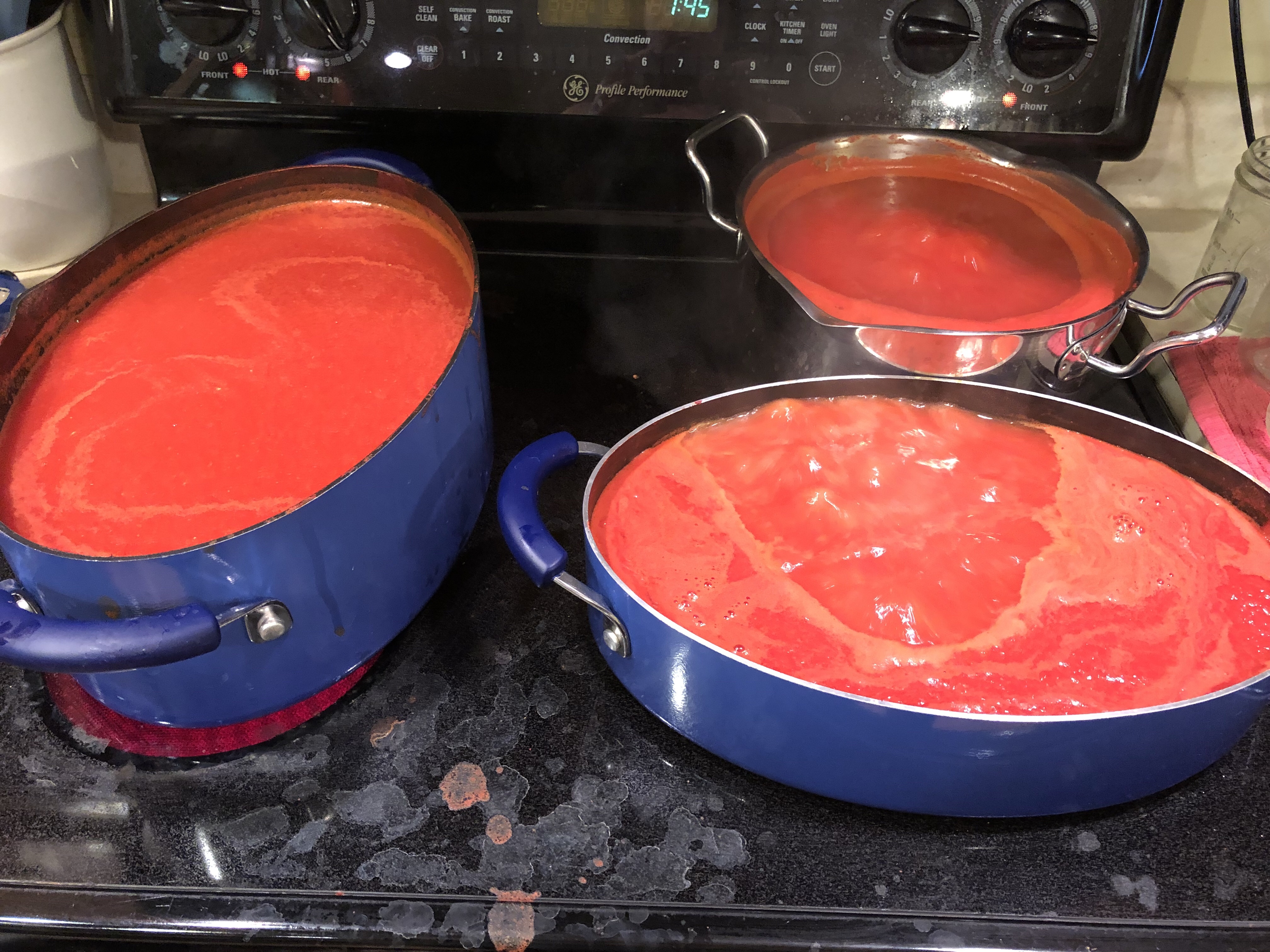 The summer garden season is upon us and I needed to clean out my freezer from last year’s tomatoes. I had four bags that were a mix of roma and summer slicers. I got the skins off and thawed out into pots. By 10 am, I had one pot of bubbling tomato water.