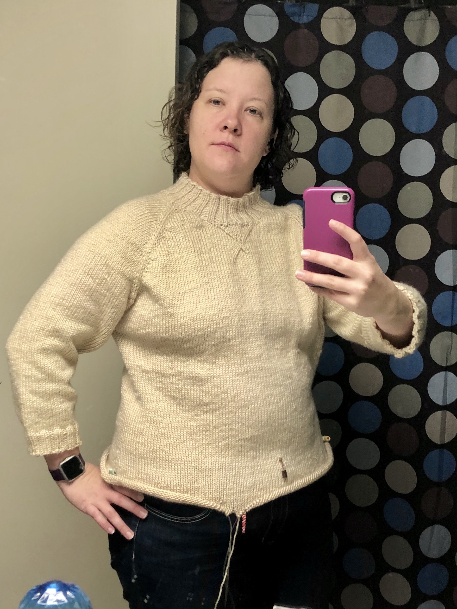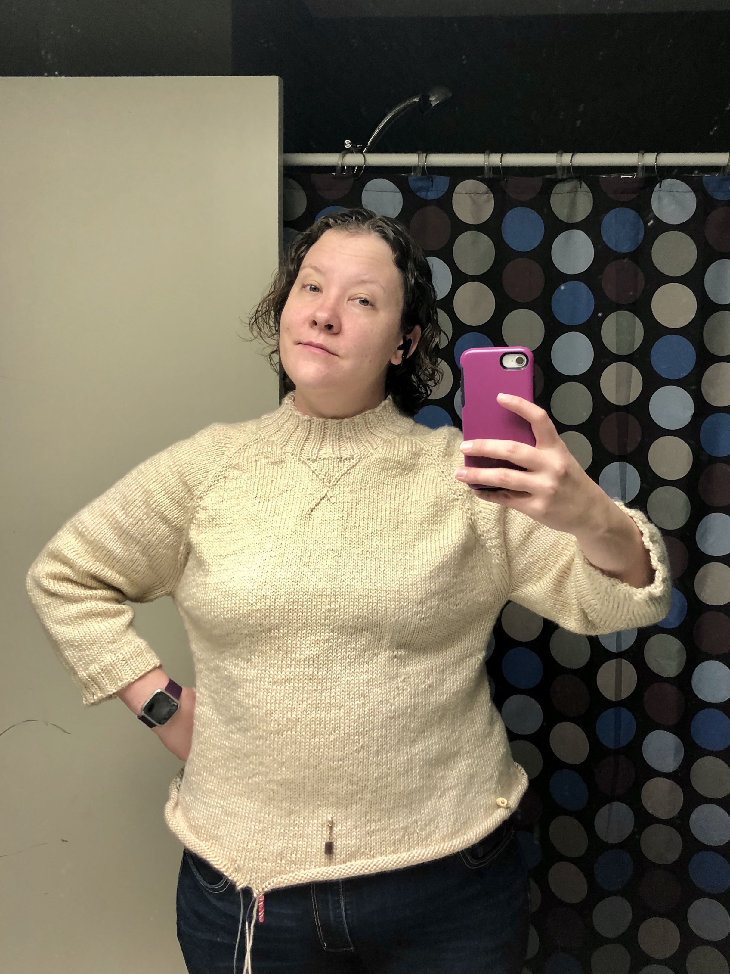I managed to slip on this garment and I’m pleased to report that it fits. It does need a good blocking for the fabric to relax into that good sweatshirt style fit I want. I’m super pleased with my alternating skeins of the hand dyed yarn. I can’t discern any pooling or flashing in the sweater body. I do not plan to alternate skeins on the first sleeve. I have enough yarn left over that I can knit the full sleeve from the same skein of yarn.
