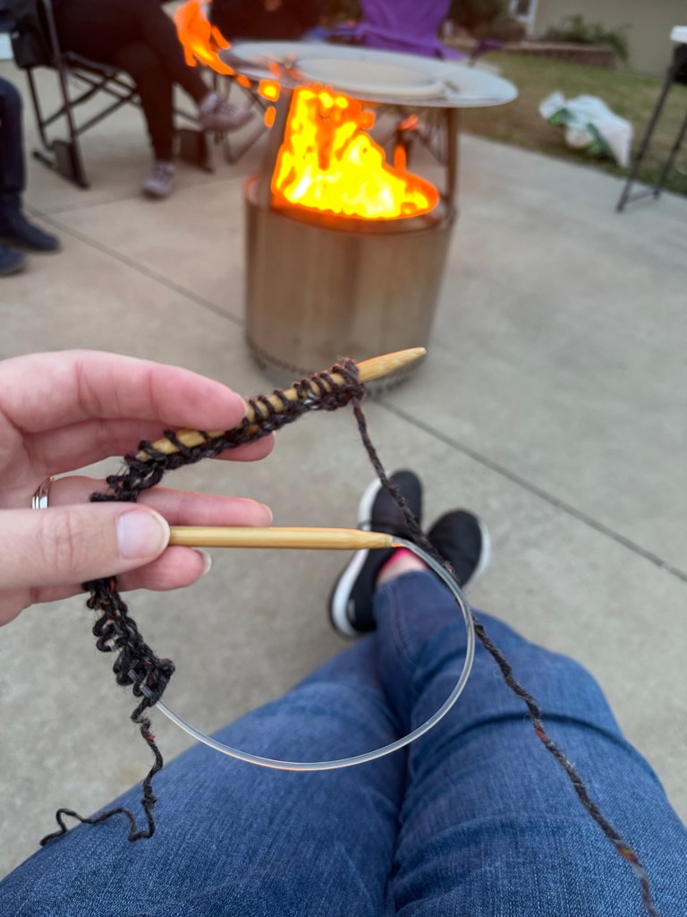 Friends invited us for a driveway hang with their new fire pit. And I didn’t have anything on hand that I wouldn’t mind to knit and have it smell like fire.