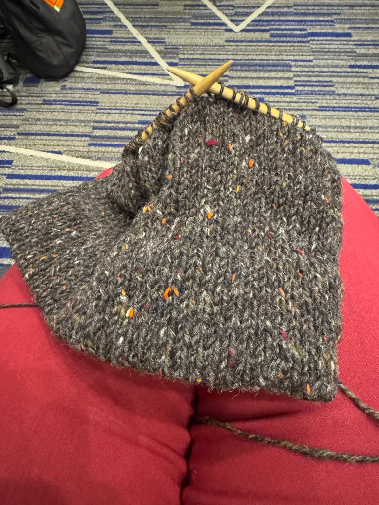 I am in meetings this week in large rooms and I am FROZEN. I firmly believe the facility I am in is running the AC. It’s wild. So I am knitting faster so I can be warm!
