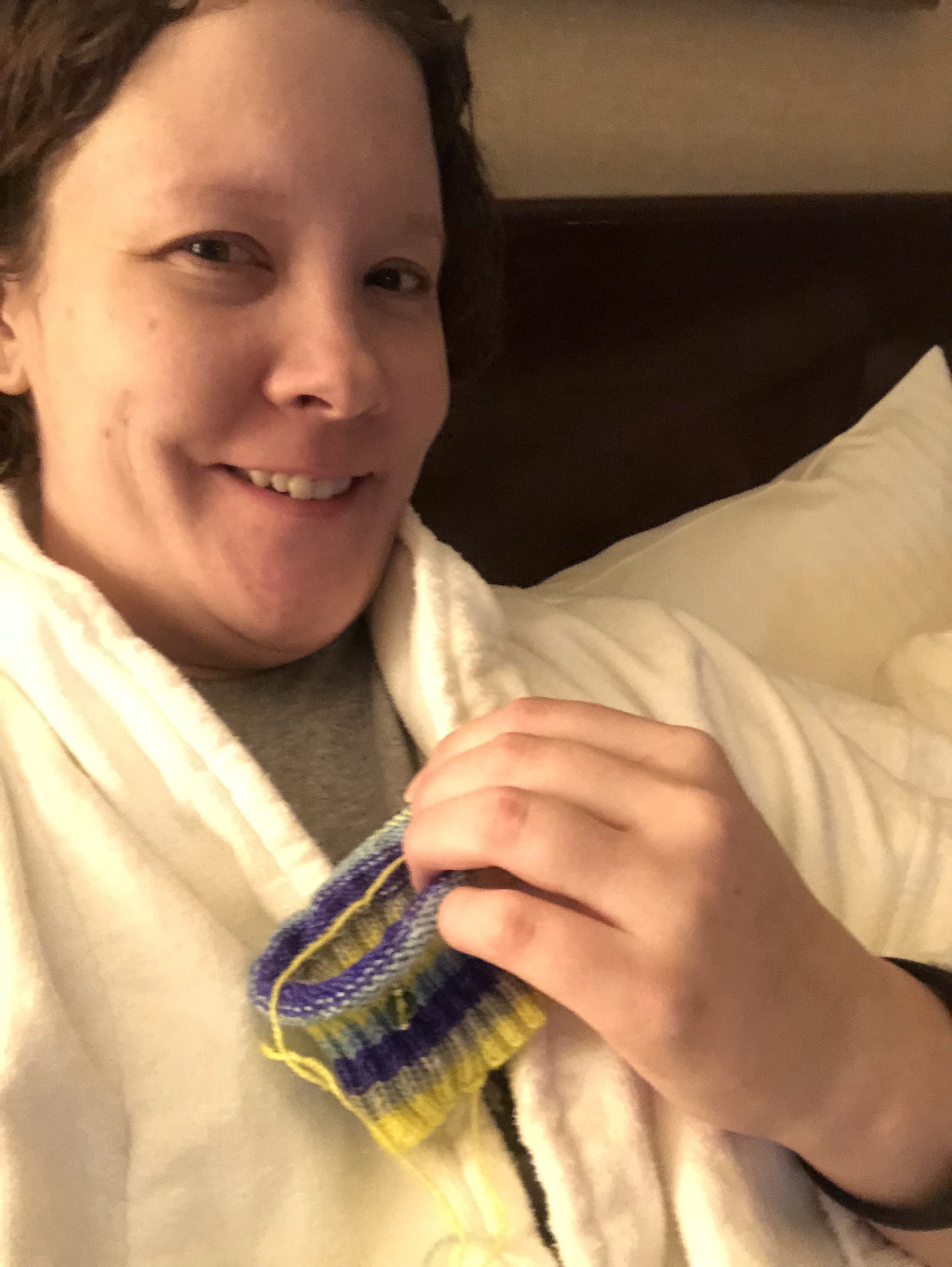 I made up for my project D’oh by knitting in the posh hotel wrapped in a plush bathrobe with the remote control all to myself! I have to say is that was pretty much heaven to a pregnant knitter after sitting in ballroom conference chairs for 7 hours!