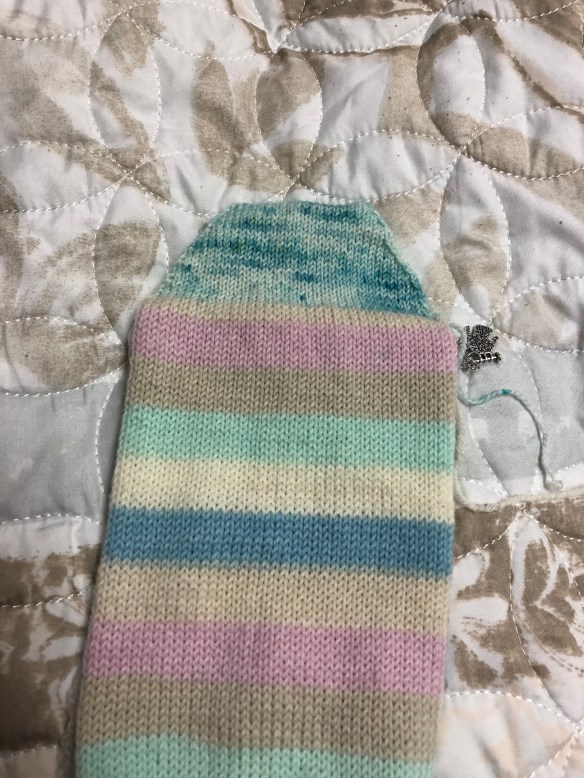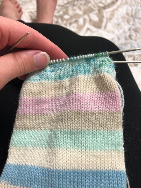 By the end of the day I was SORELY uncomfortable in the waiting room chairs. I had managed to snag my dad the one recliner in the room so he could put his feet up and take a rest. But I had managed to put six stripes into the foot of sock number two. I only have two more stripes and I will place the waste yarn for the heel.