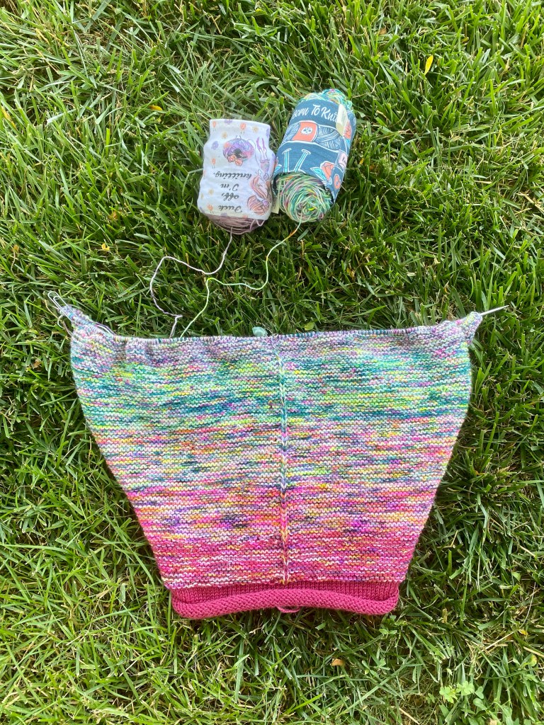 Yarn: Mrs Crosby Hat Box in Pansy (purple), green variagated mystery sock yarn, Spunky Eclectic Spunky Sock in Wild Child (pink) and Shibui Knits Staccato in Raspberry