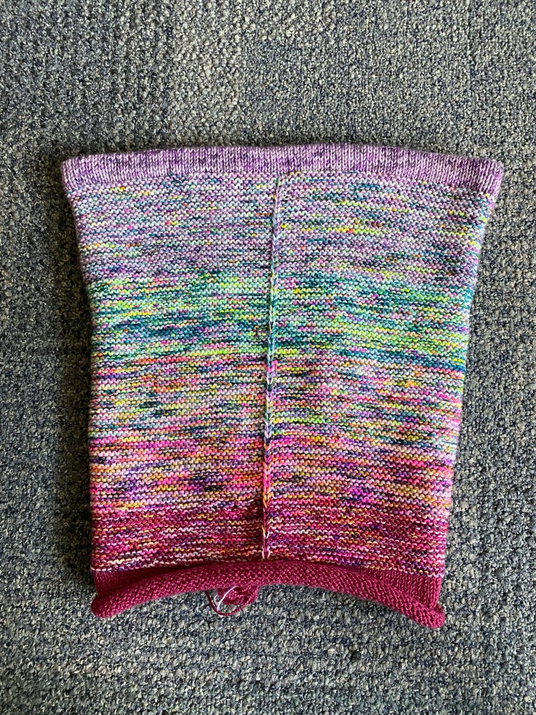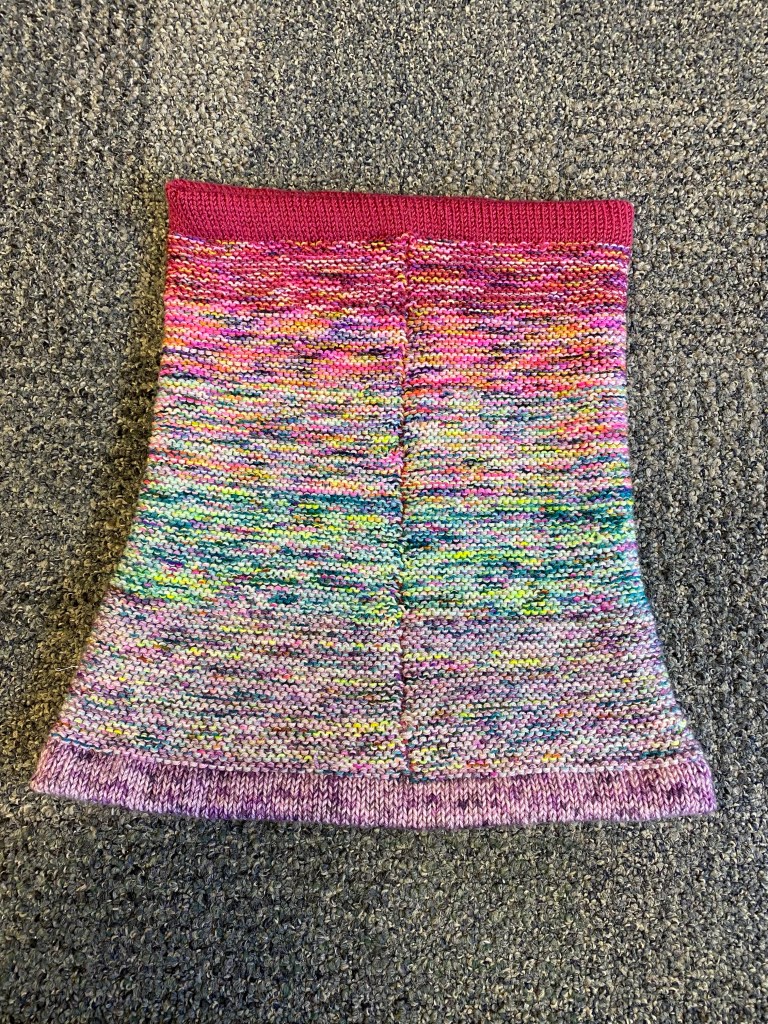This was a really good stash buster. I didn’t use up any of the yarns completely but I did crank out a project that used 873 yards of yarn or roughly the equivalent of two skeins of sock yarn. Can’t beat that! And I have enough of each color to add at least one square on my mitered square memory blanket.