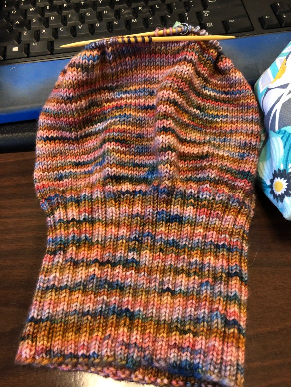 I managed to use up as much yarn as I dared without risking yarn chicken. I used 93 grams or 215 yards of this DK weight yarn. The resulting hat is a bit snug in my opinion but my husband thought it felt like any other beanie hat. This has 10% cashmere and that doesn’t suck. It’s a lovely next to the face kind of feel. Maybe it could have used 4 to 8 more stitches in the total stitch count.