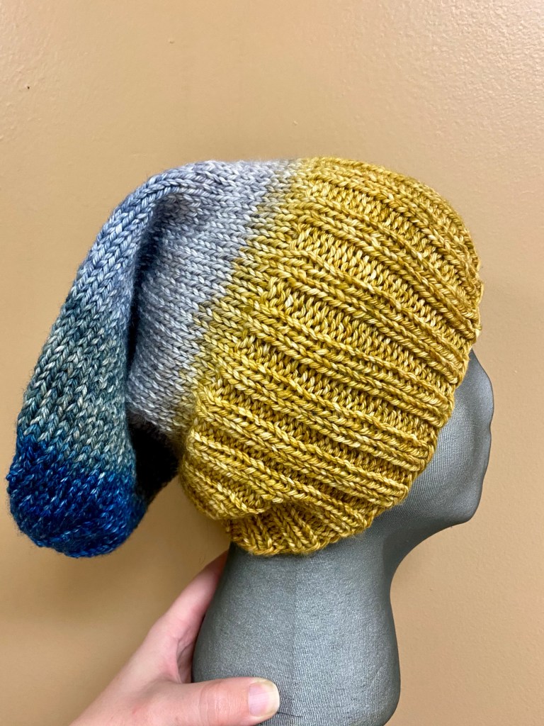 This hat probably won’t fit the hugest head but will fit an average adult or large child. The fabric did end up very robust and dense so this will be a very warm hat. This has been tucked away in the cedar chest for whenever I need a gift. I didn’t knit this one with a recipient in mind.